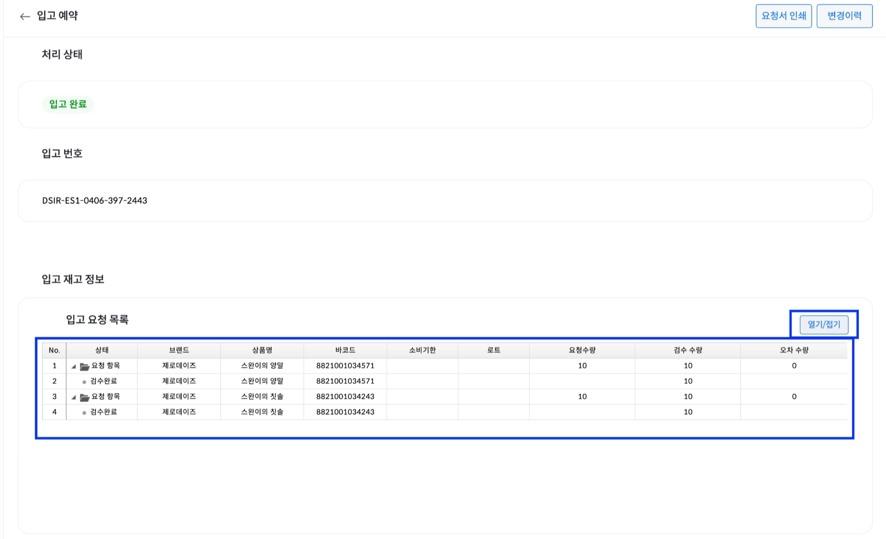 [입고 요청 목록]의 [열기/접기] 버튼을 통해 요청항목 별 상세 내용을 확인할 수 있어요.