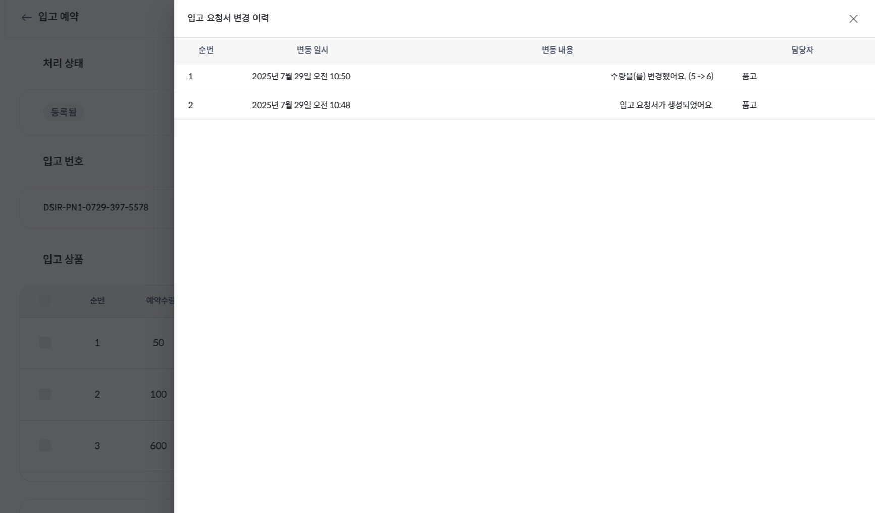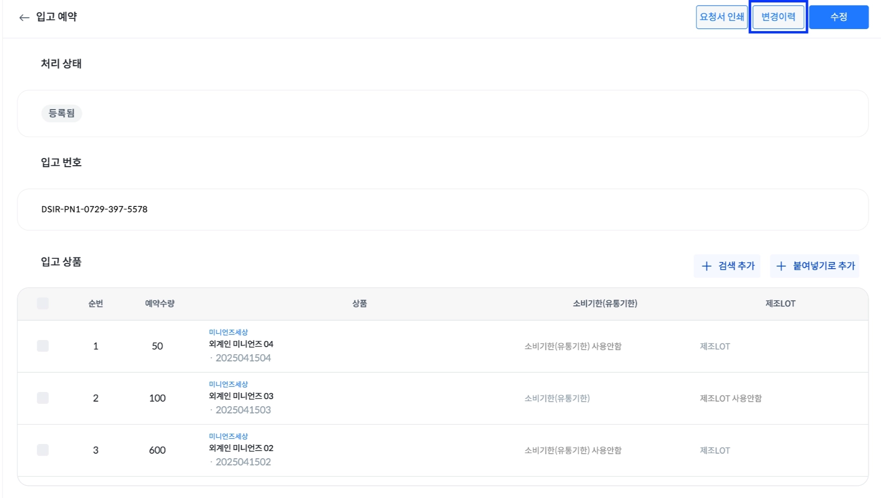 입고 예약 화면 오른쪽 상단에 [변경이력] 클릭합니다.