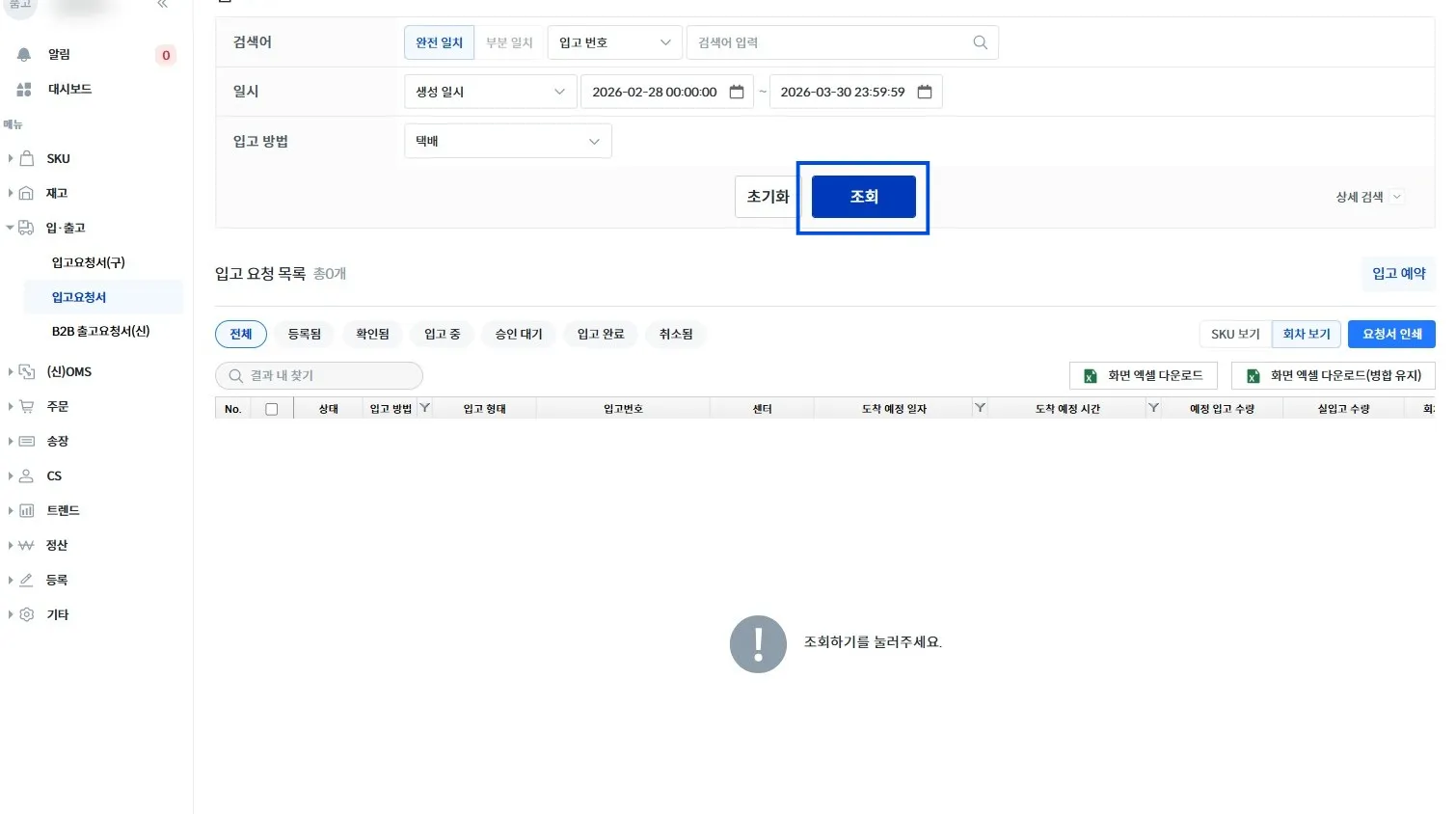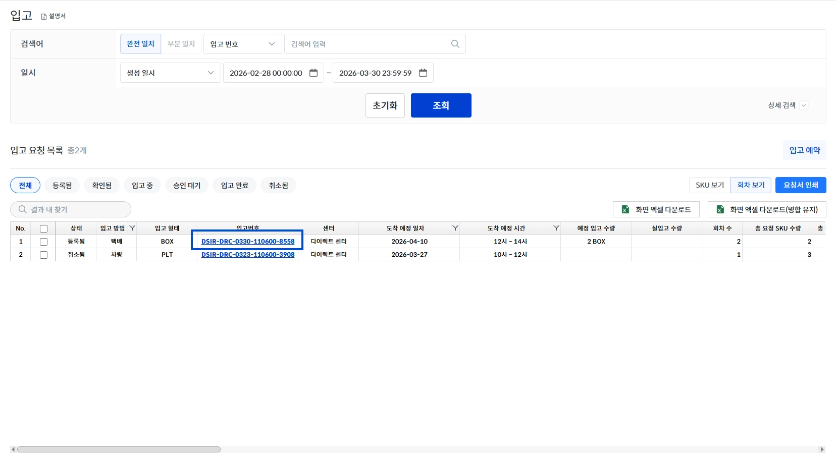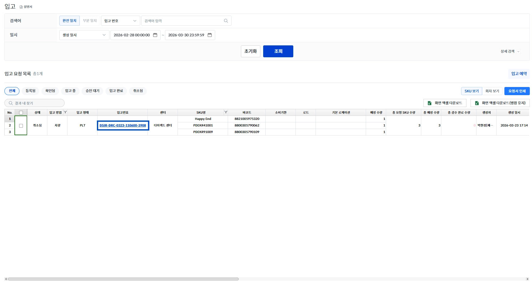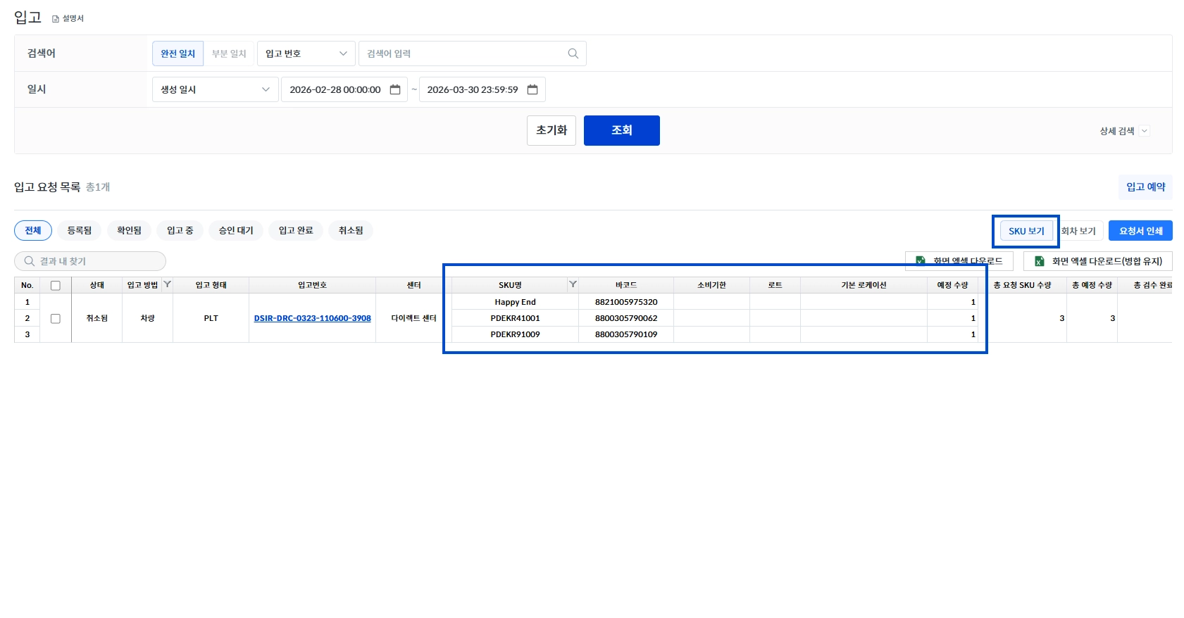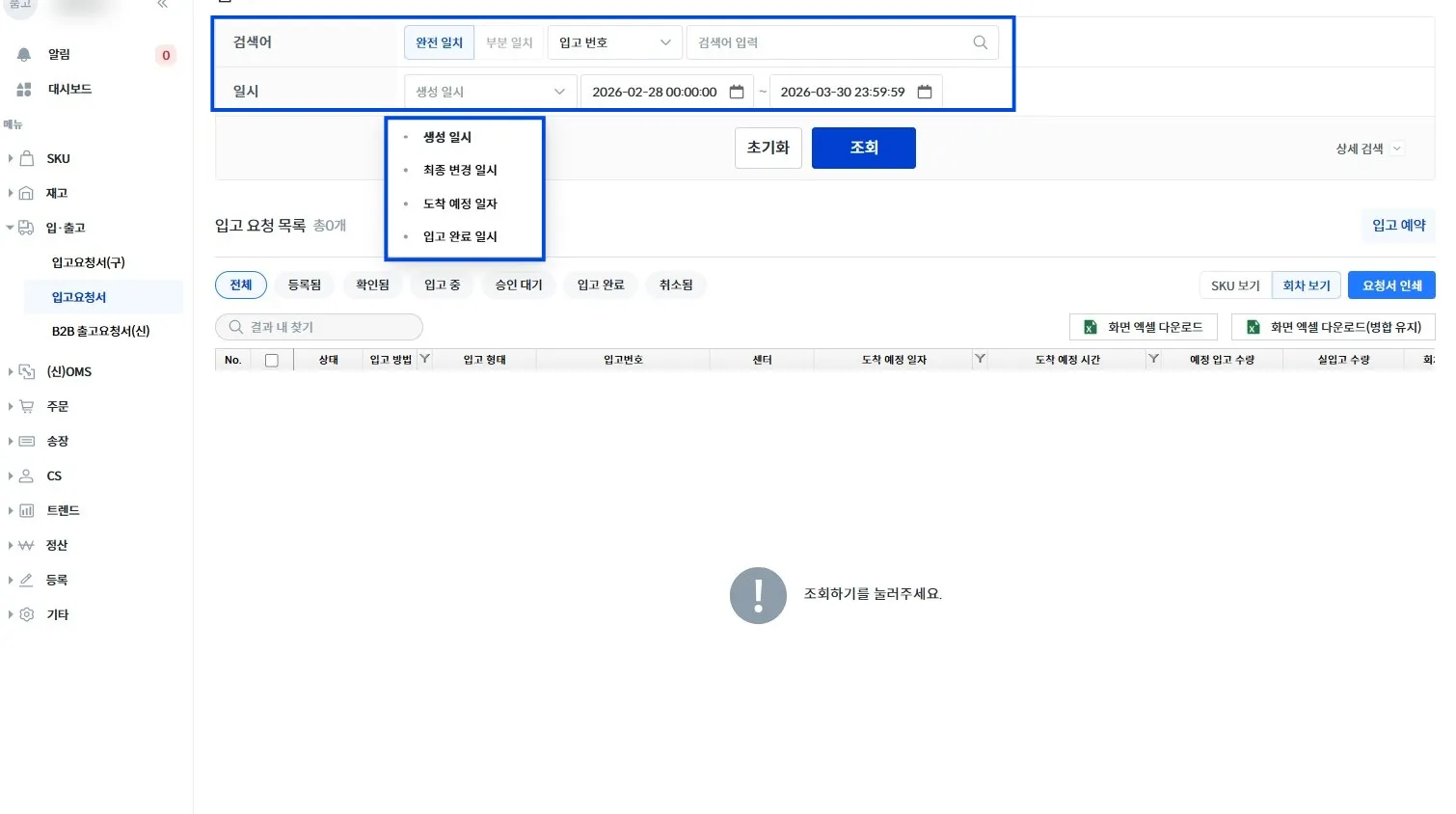입고 번호와 일시를 설정하여 조회해 주세요. 조금 더 빠르게 조회가 됩니다.