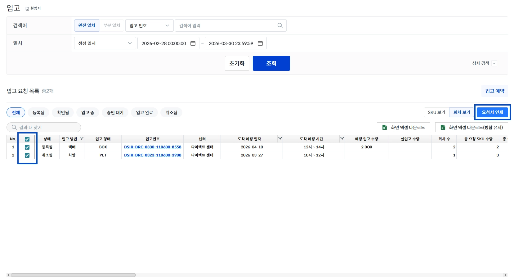 인쇄할 입고요청서를 모두 체크한 후 [요청서 인쇄] 눌러주세요.