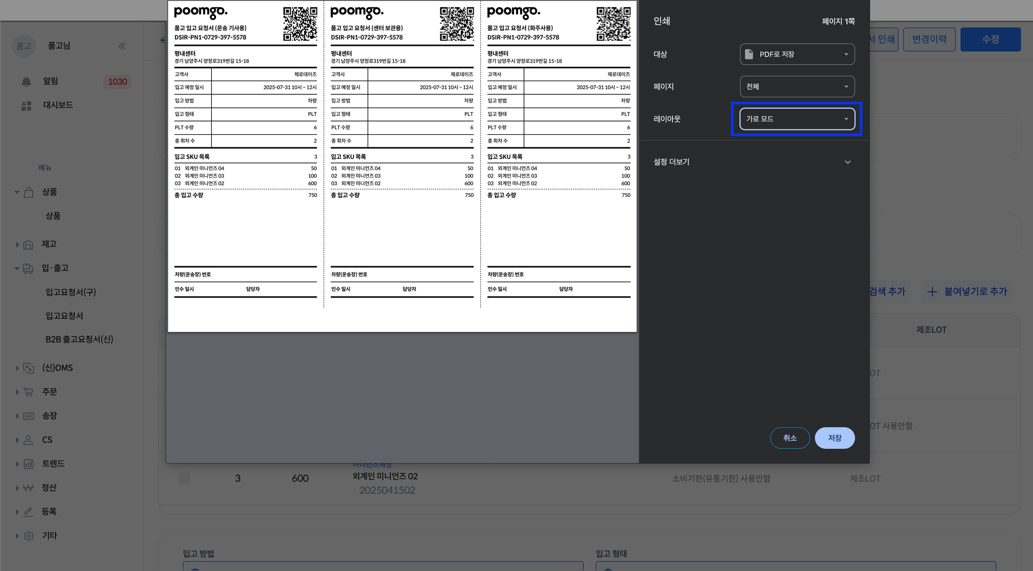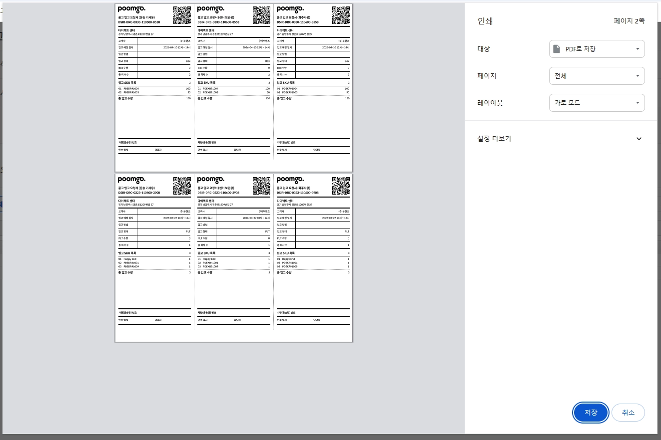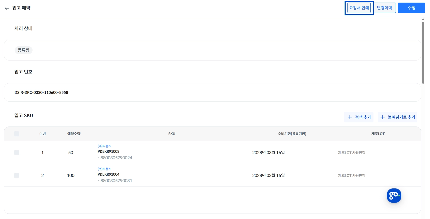 입고 예약 화면 오른쪽 상단에 [요청서 인쇄] 클릭 합니다.