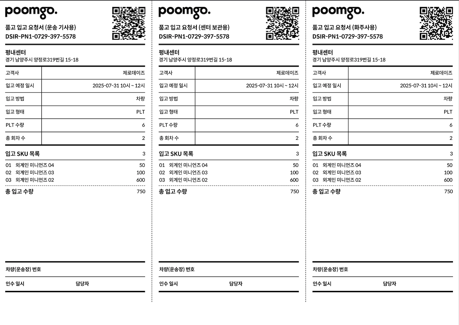 입고 요청서는 [운송 기사용] [센터 보관용] [화주 사용]으로 3등분 구성 되어 있습니다.