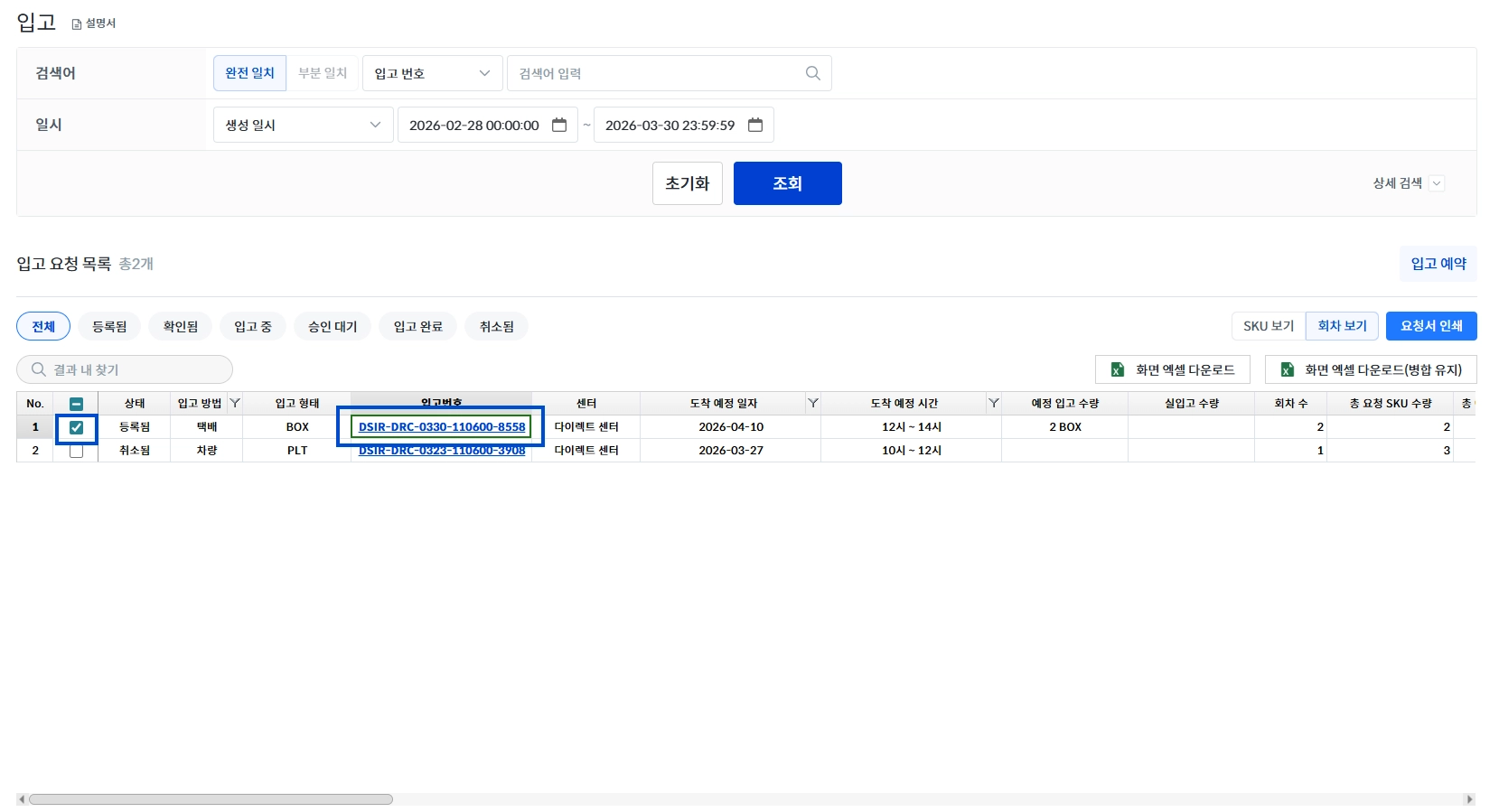 입고 요청서는 입고 예약 후 입고예정인 실물과 같이 동봉되어야 합니다.