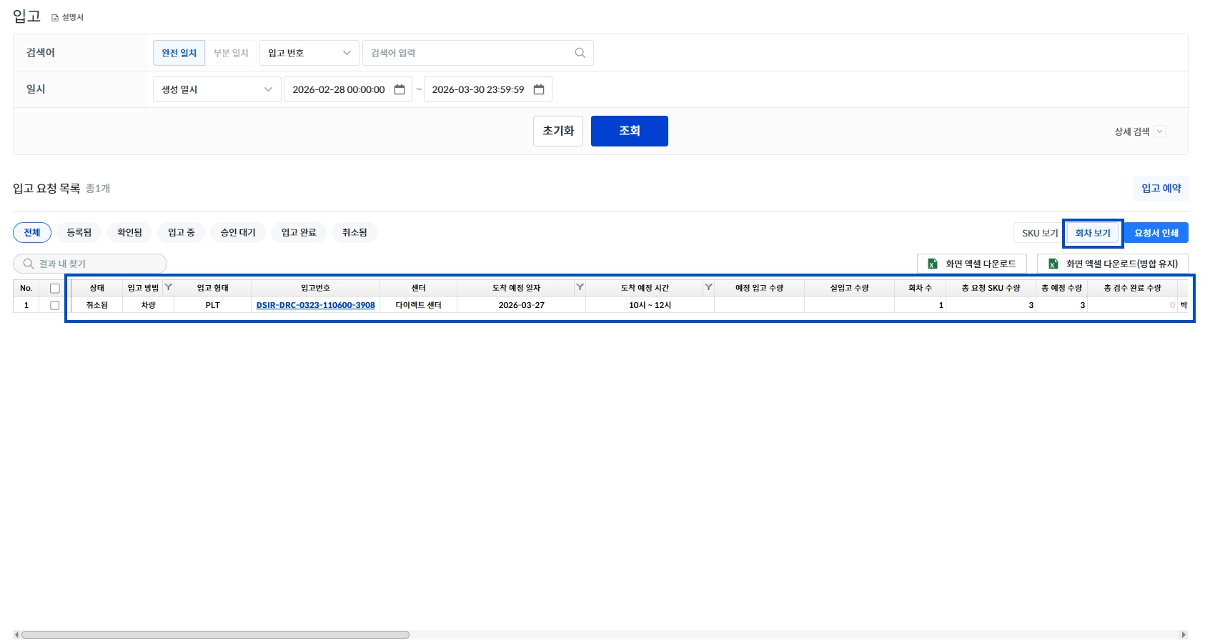 [회차 보기] 클릭하면 여러 차수의 입고 내역을 편리하게 구분할 수 있어요.