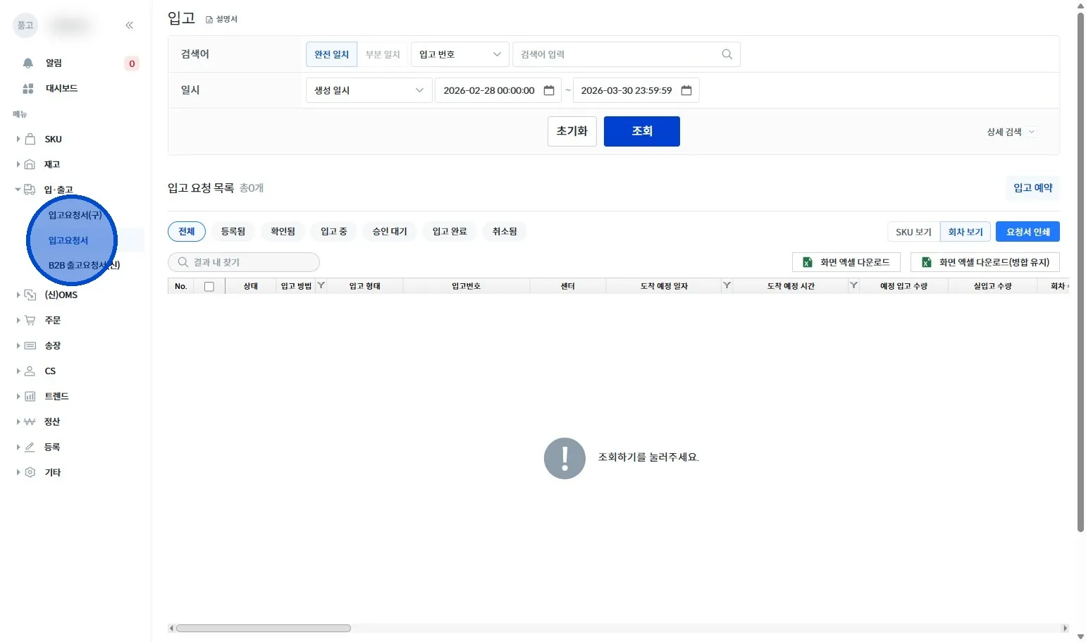 왼쪽 메뉴에서 [입 .출고 → 입고요청서] 클릭해 주세요.