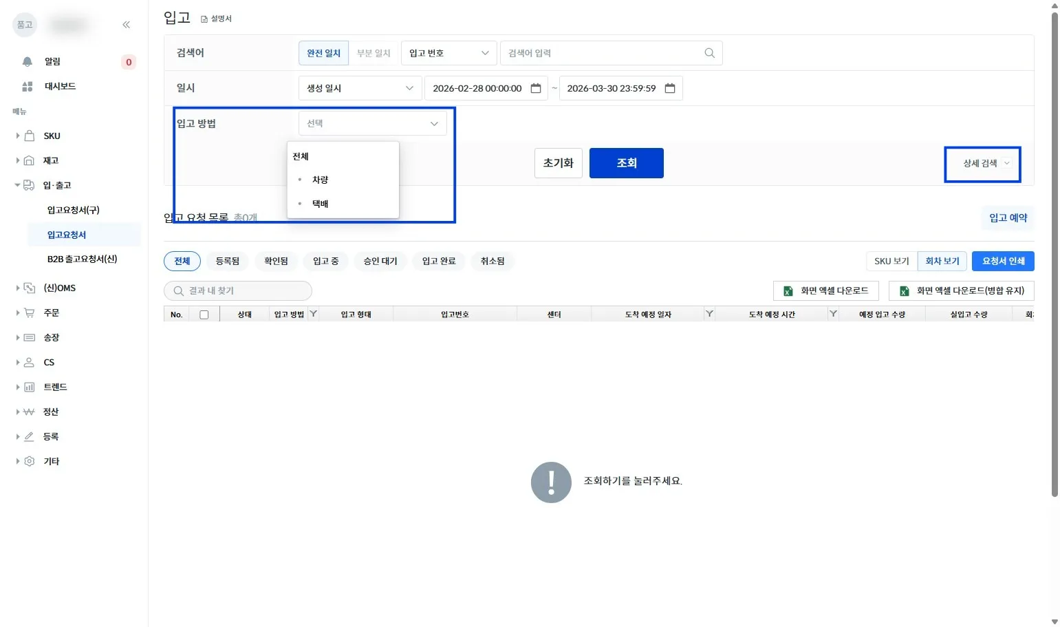 오른쪽의 [상세검색] 펼치면 입고 방법도 선택하여 조회 가능합니다.