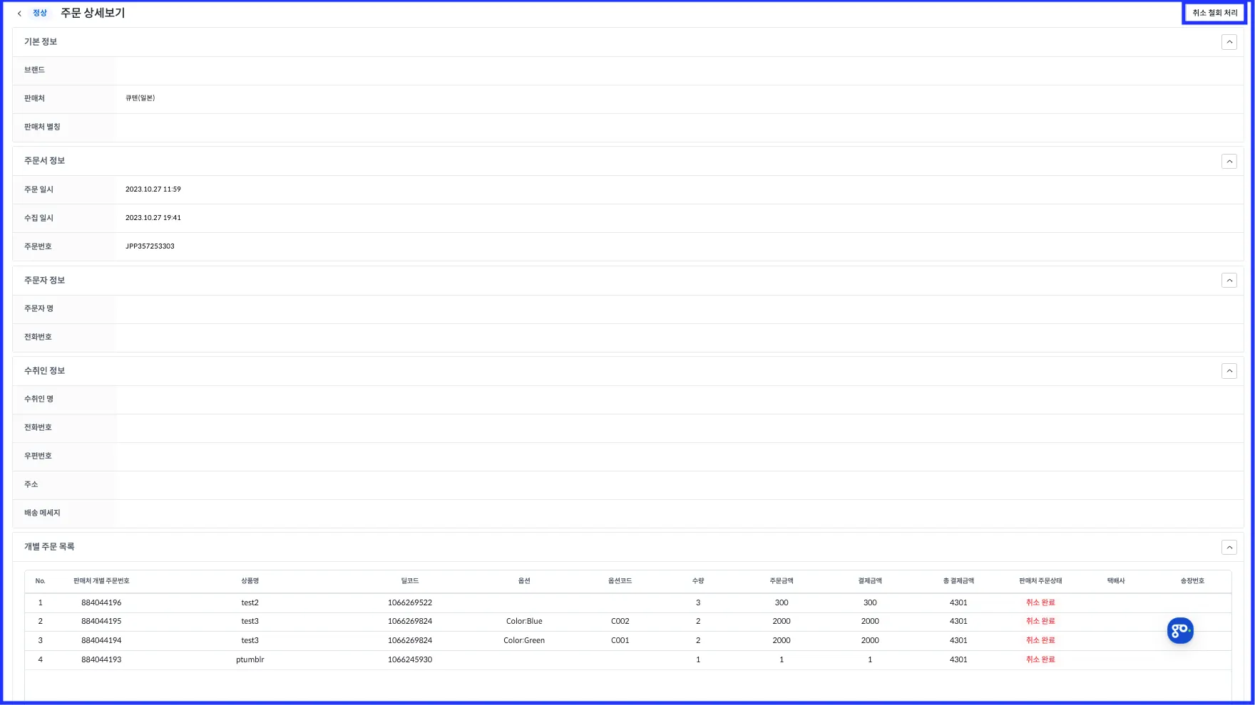하지만 샵링커를 통해 수집된 주문은 ‘취소 철회’ 상태가 자동 반영되지 않습니다.이에 따라, 샵링커 주문에 한해 수동으로 철회할 수 있는 기능을 제공하고 있습니다.