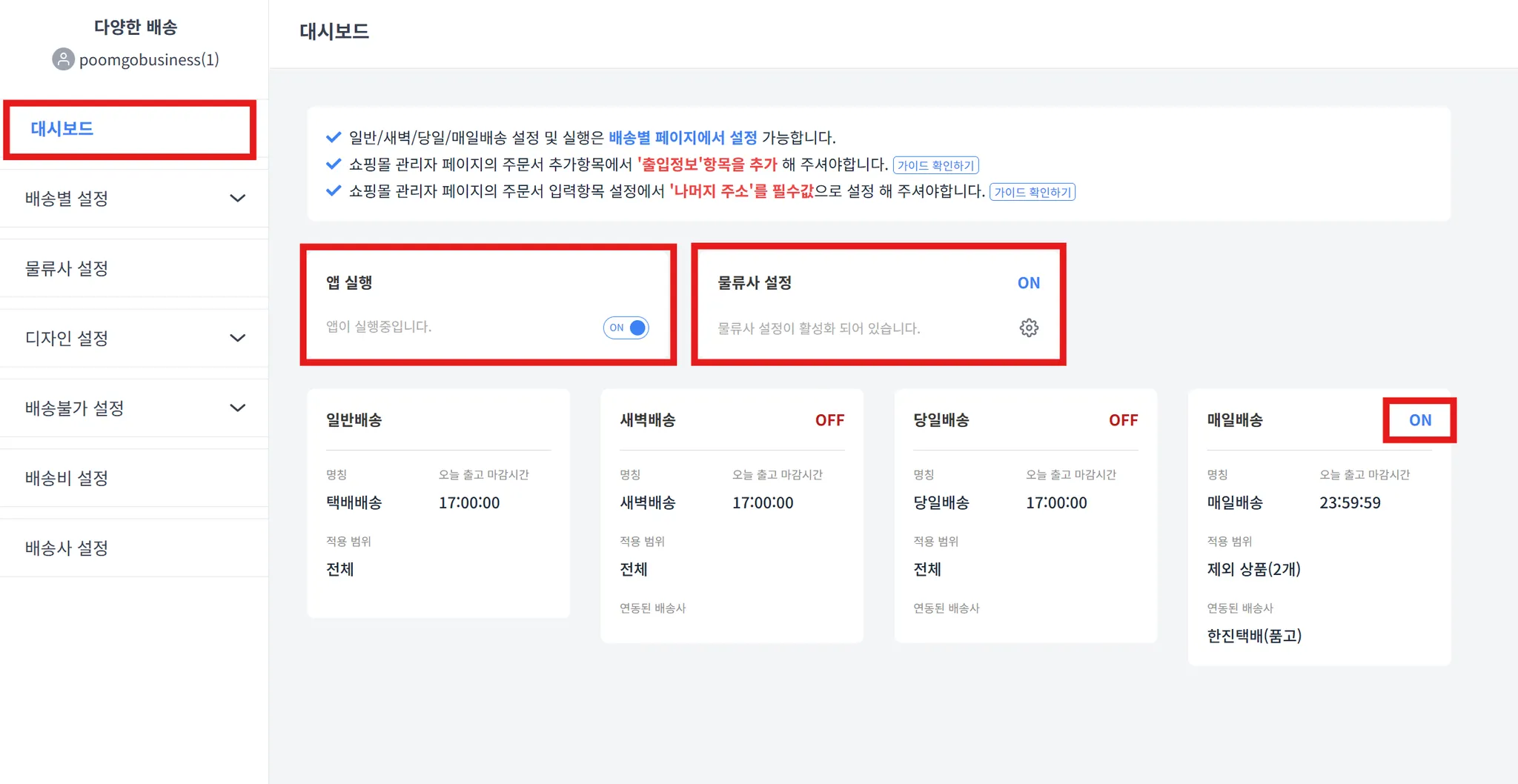 ‘다양한 배송’ 앱의 ‘대시보드’ 메뉴에서 앱 실행을 ‘ON’으로 설정해 주세요.
