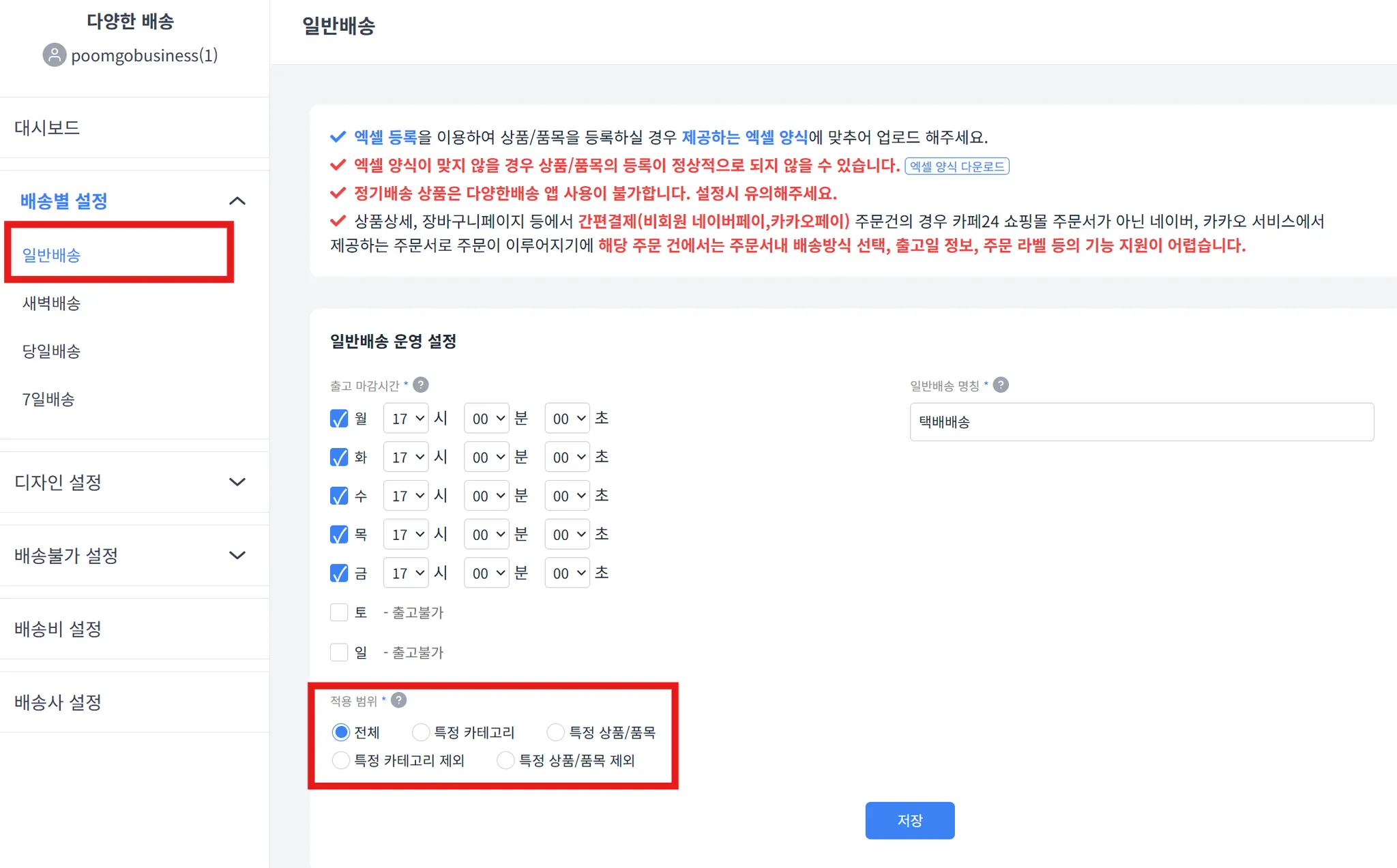 ‘배송별 설정’ > ‘일반배송’의 적용범위를 설정해 주세요.
