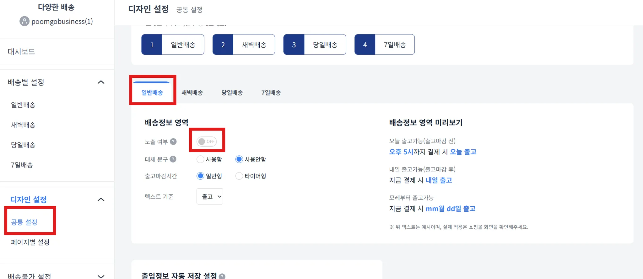 ‘디자인 설정’ > ‘공통 설정’ > ‘일반배송’ 탭을 클릭해 주세요.