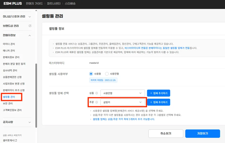 접속 경로: ESM+ 로그인 > 좌측 메뉴 리스트에서 판매자정보 > 셀링툴 관리 클릭