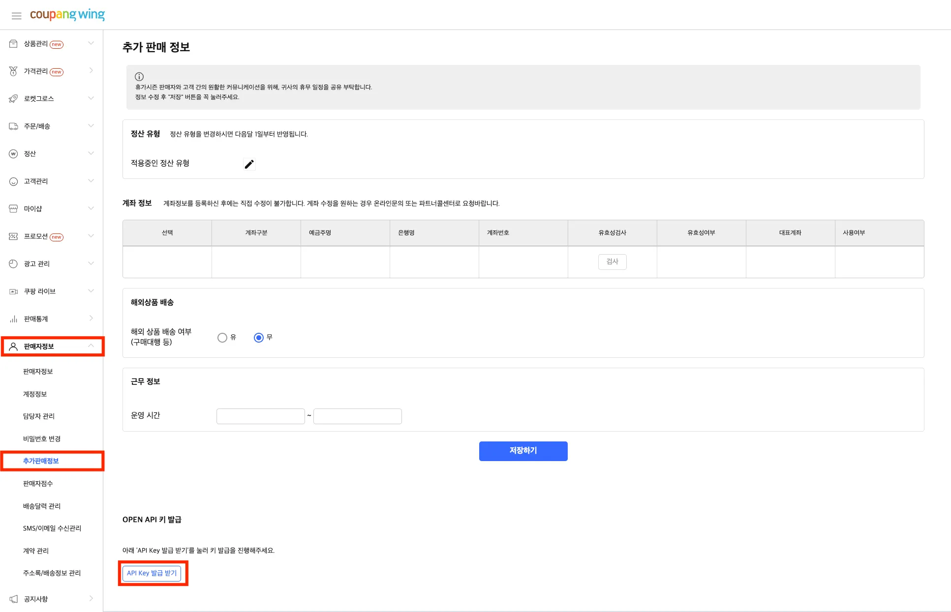 어드민 로그인 후, 좌측 메뉴에서 판매자정보 → 추가판매정보 이동 → 하단에 API Key 발급 받기 클릭