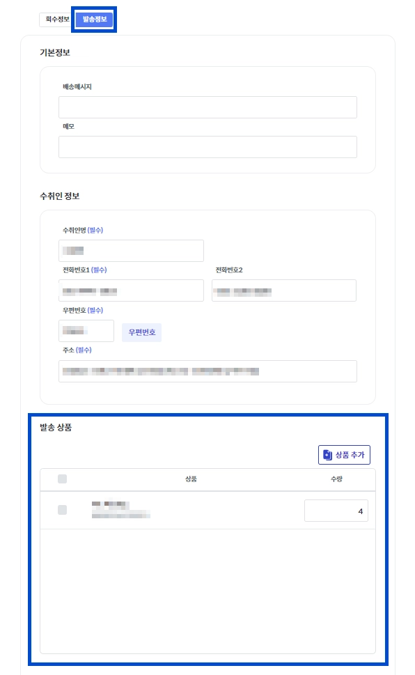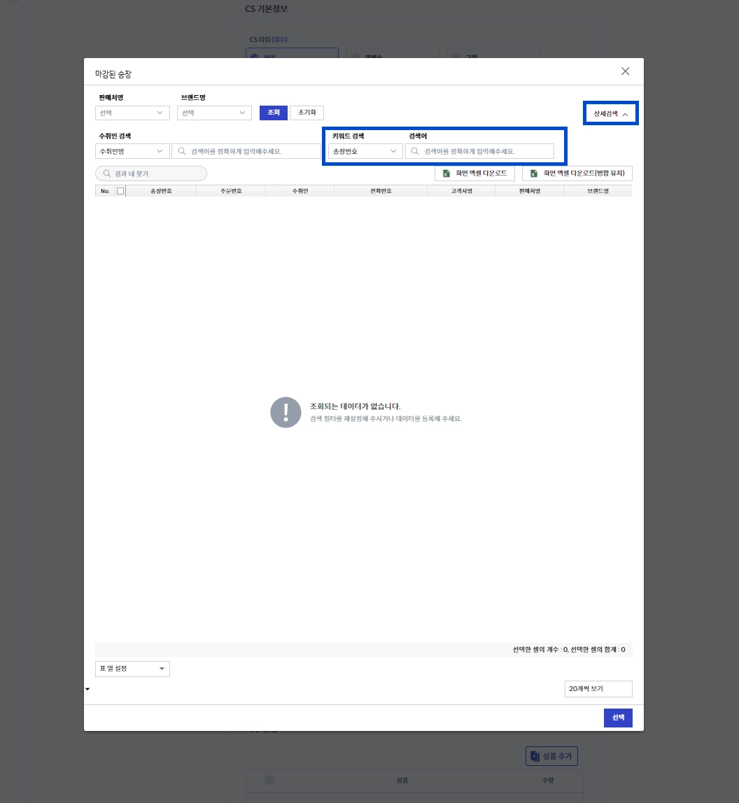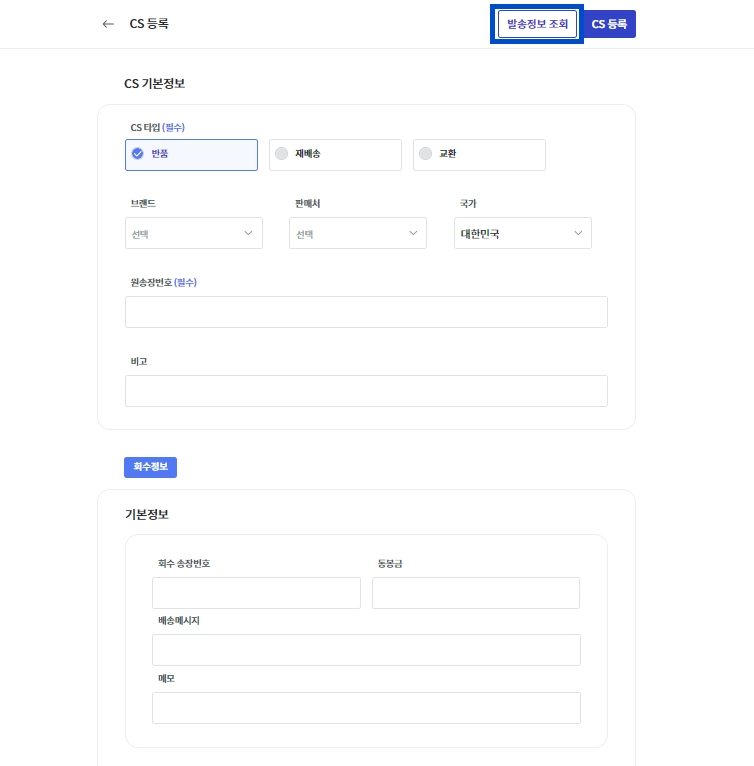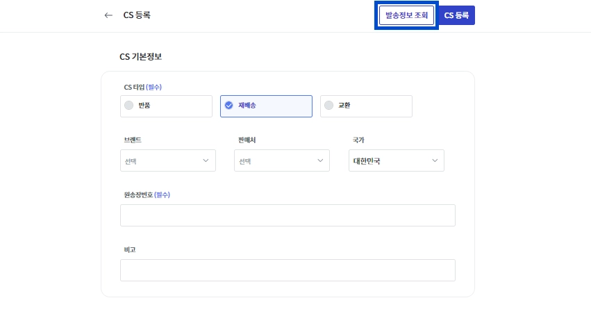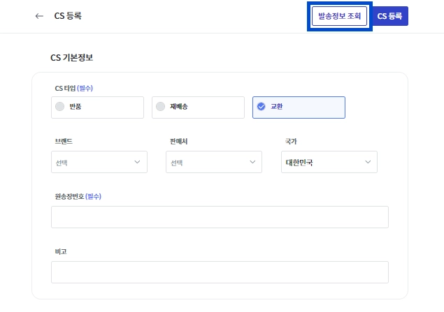 CS 등록창에서 상단의 [발송 정보 조회]를 눌러주세요.