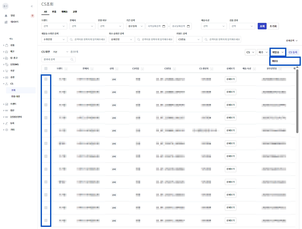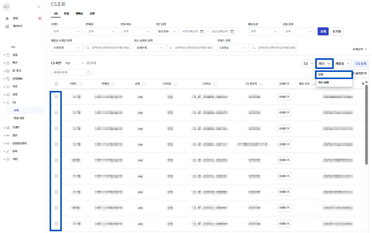 [CS → 조회]에서 상태가 [준비]인 재발송 건들은 회수 요청이 가능합니다.