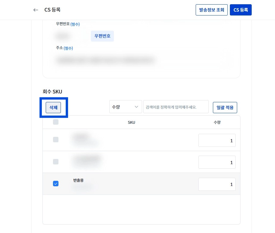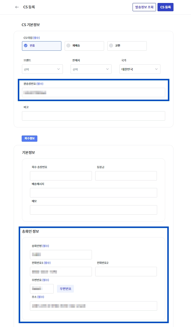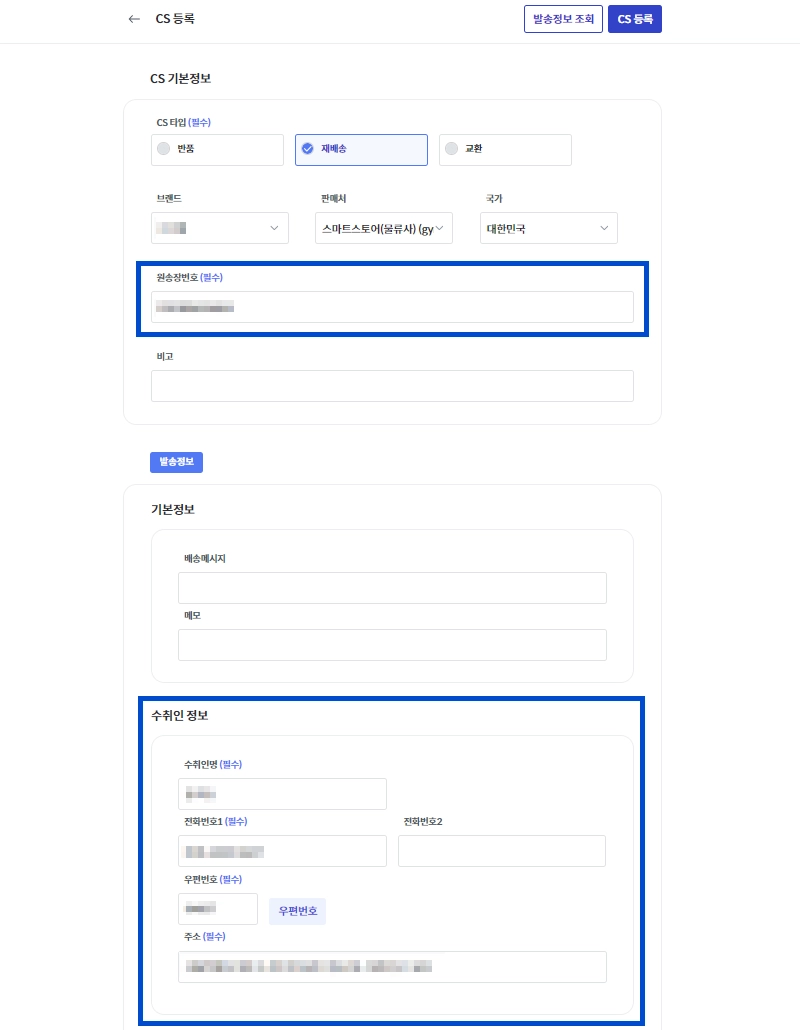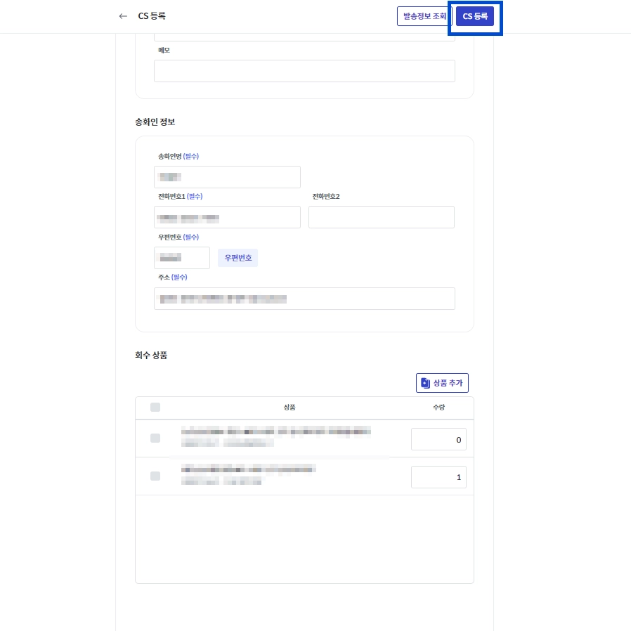 CS 등록만으로는 회수와 재발송이 진행되지 않습니다.