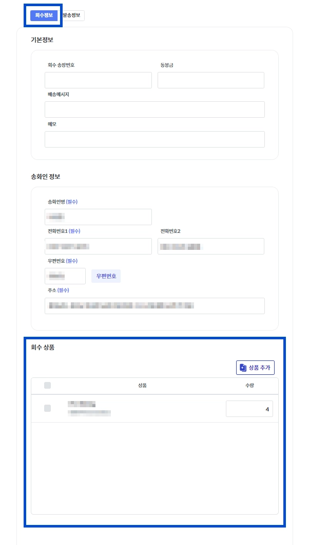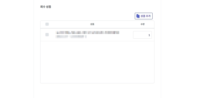 수정이 필요하다면 [상품 추가]를 눌러 회수가 되어야 할 품목을 설정하고, 기존 품목을 체크하여 삭제해 주세요.