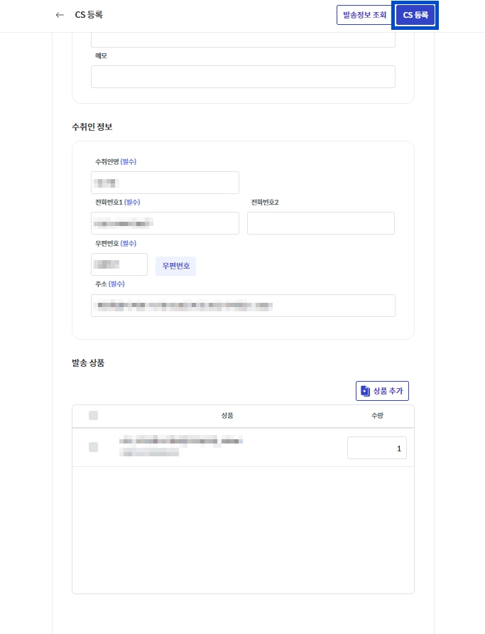 상단의 [CS 등록] 버튼을 눌러 등록을 완료해 주세요.
