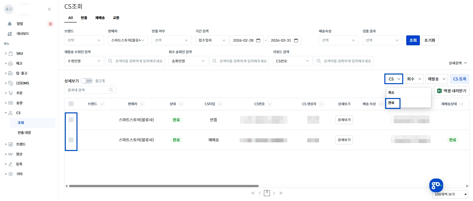 재발송 → 등록한 CS 1건에서 재발송 요청만 가능