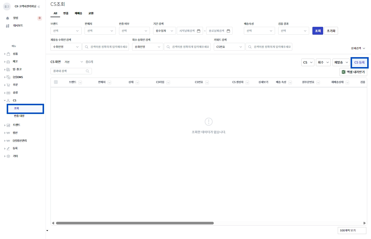 품고나우 좌측 [CS → 조회]로 접속하여 [CS 등록] 버튼을 클릭해 주세요.