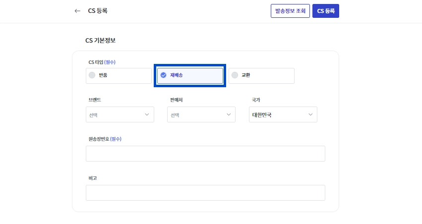 CS 타입을 [재발송]으로 선택해 주세요.
