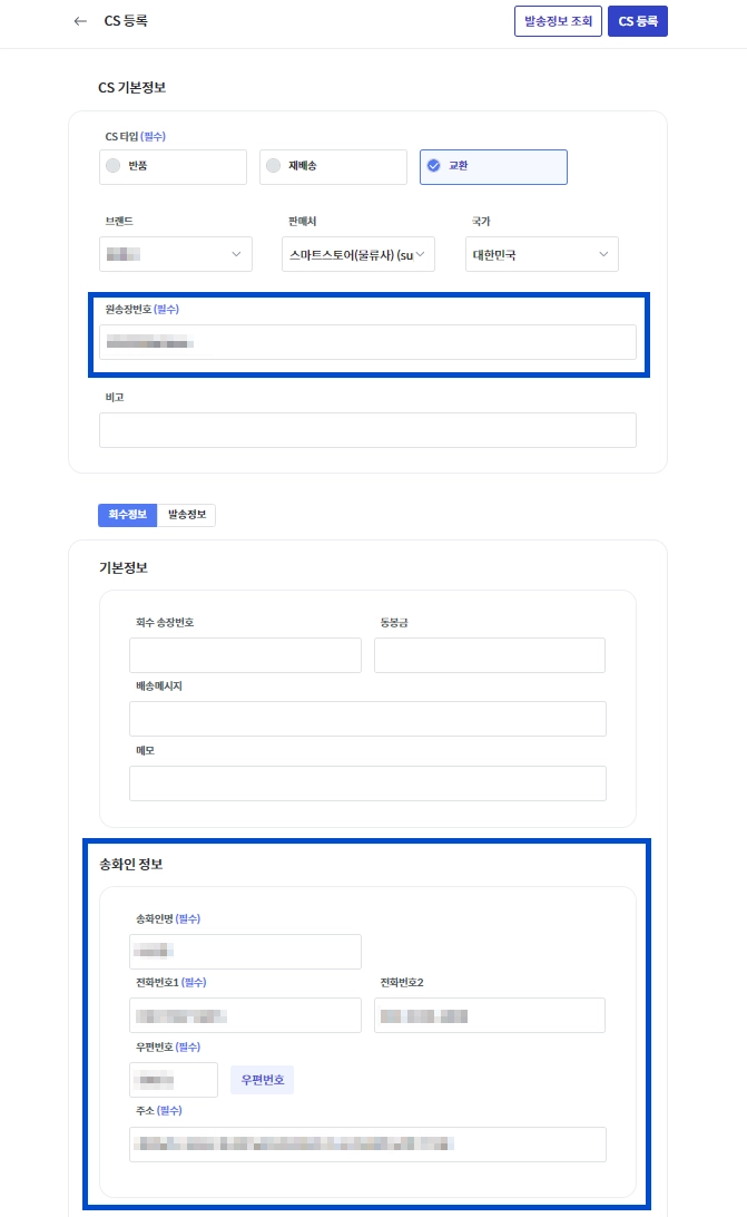 CS 타입이 [교환]인 경우, CS 1건당 회수 요청 1회와 재발송 요청 1회를 모두 진행할 수 있습니다.