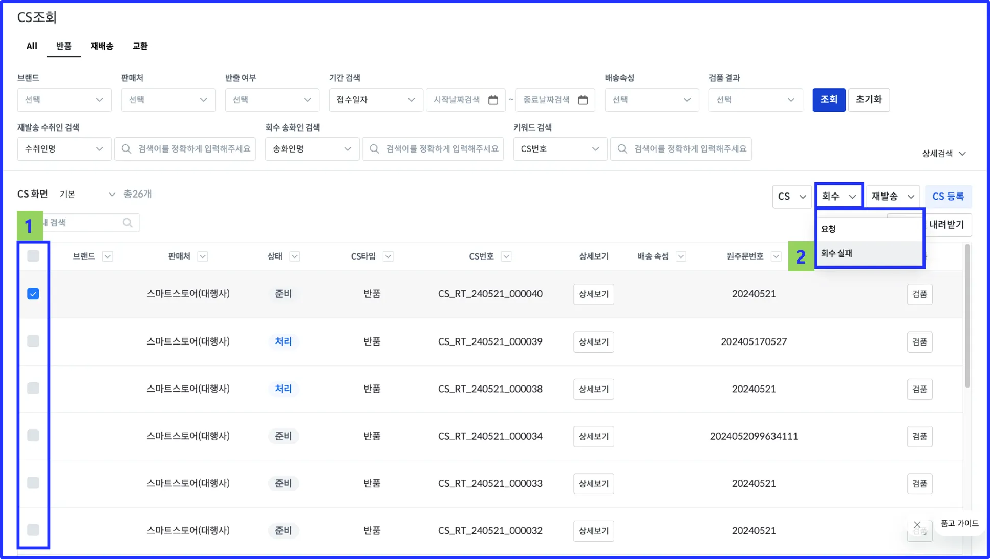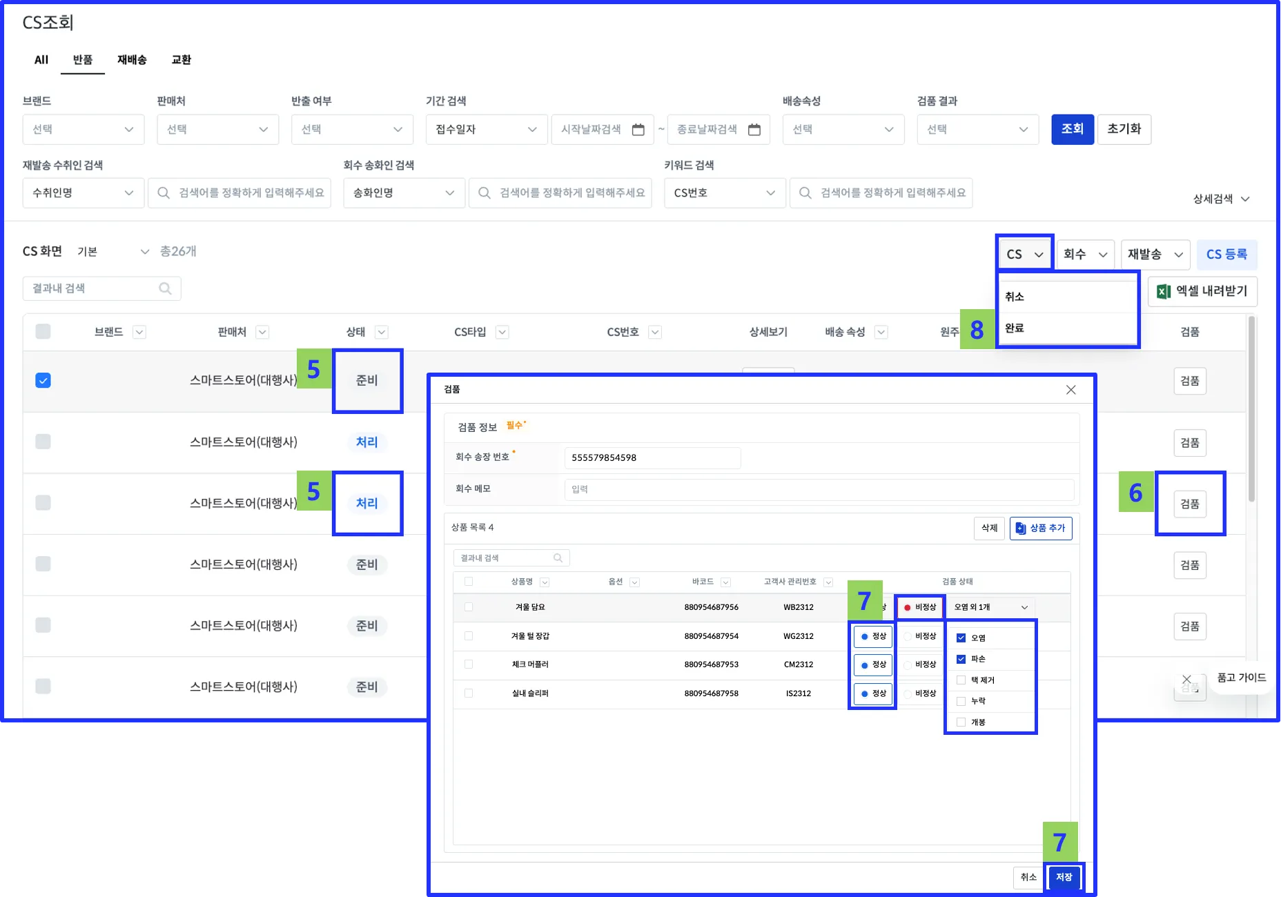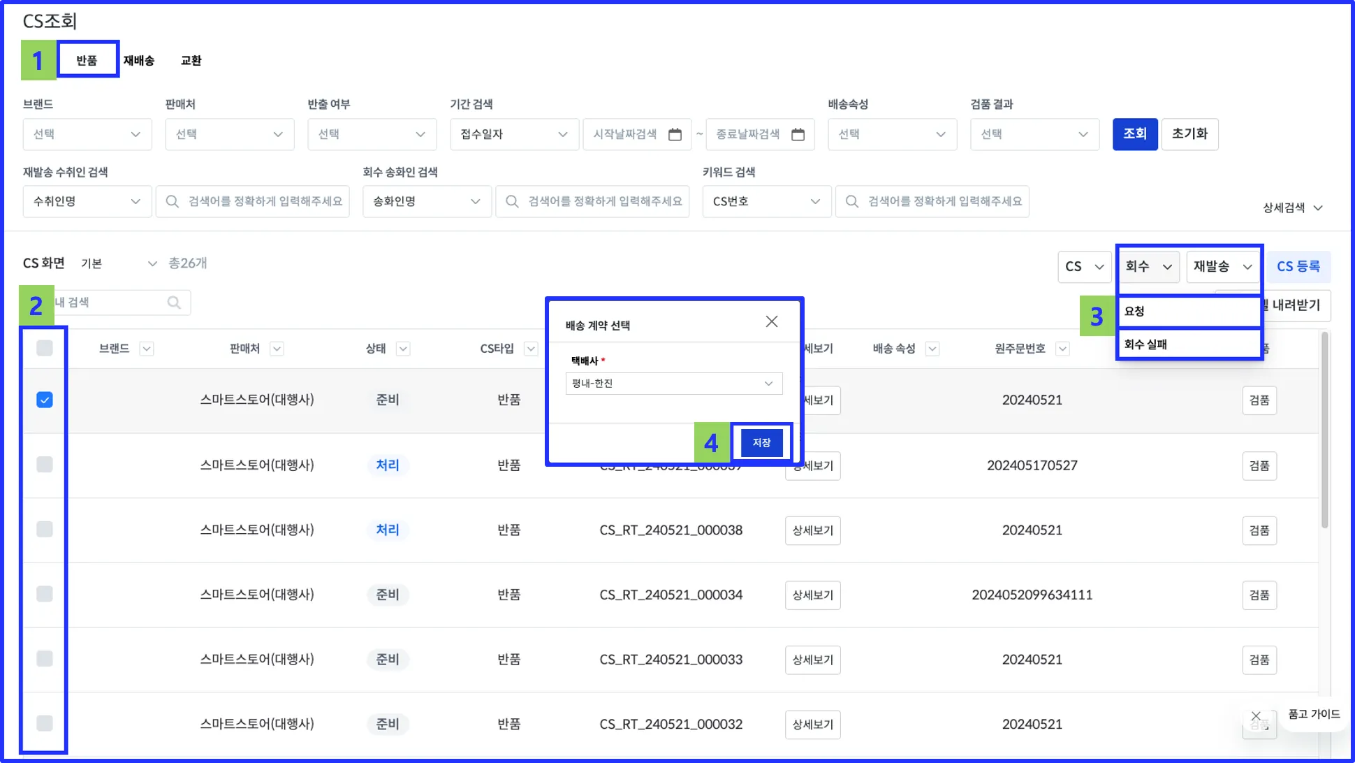 CS타입(준비 → 처리) 과 반품상태 (준비중 → 회수 요청) 변경