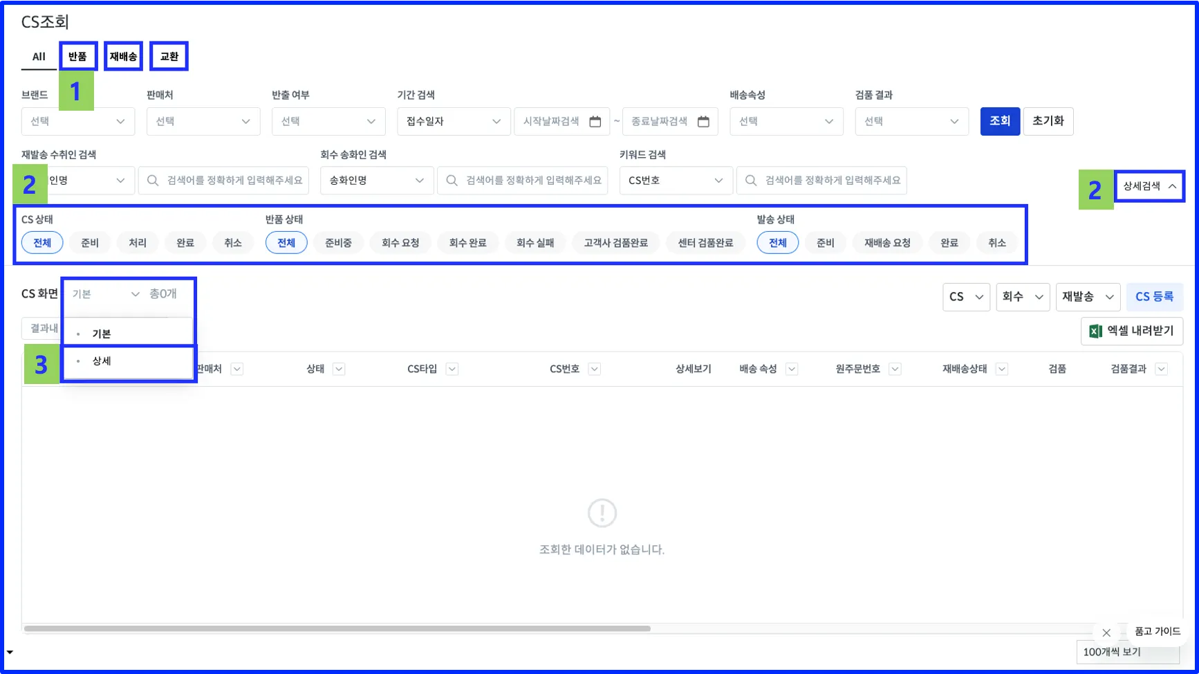 2.상세검색 클릭 시 CS상태 / 반품 상태 / 발송상태로 구분하여 조회가 가능