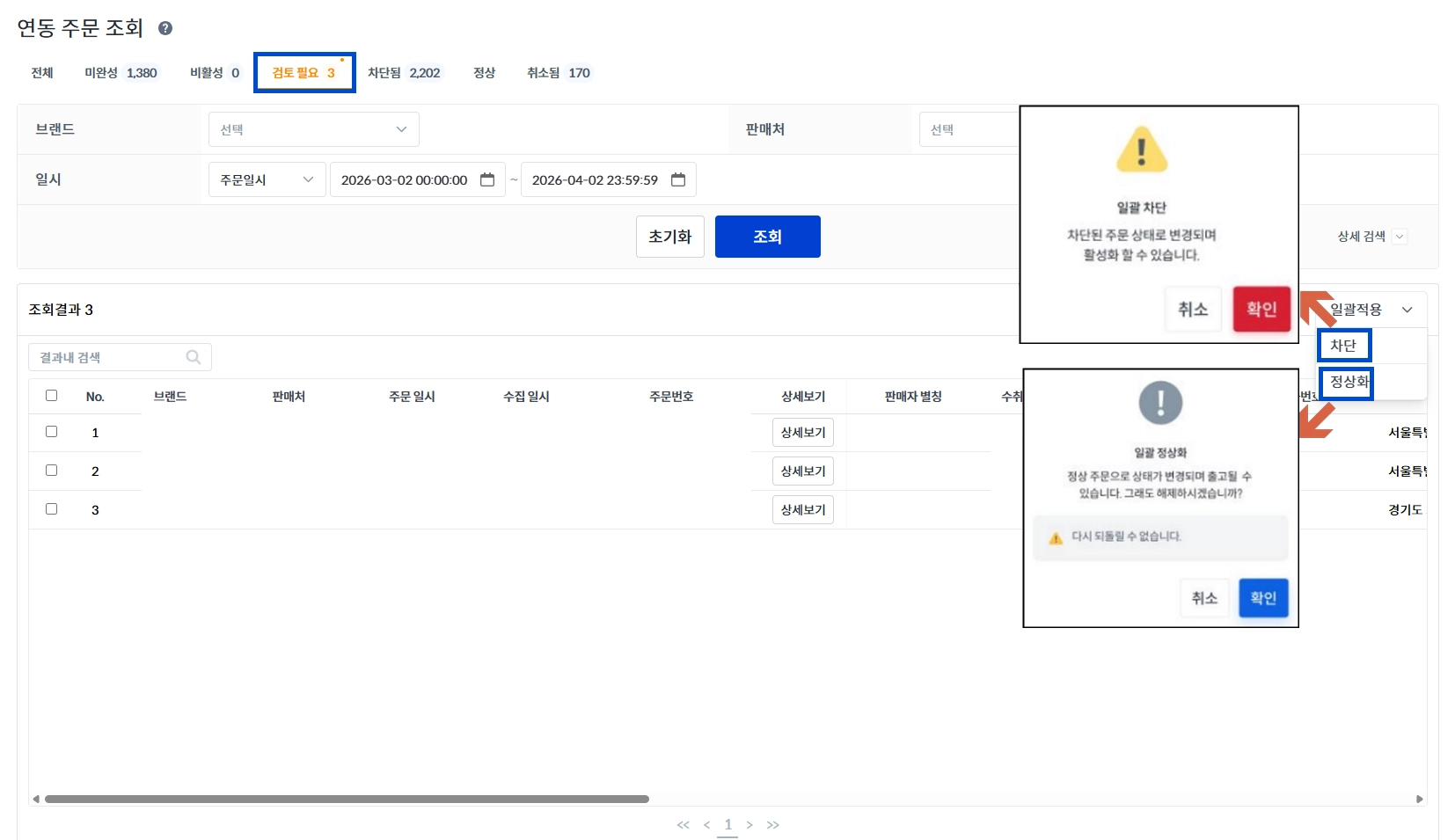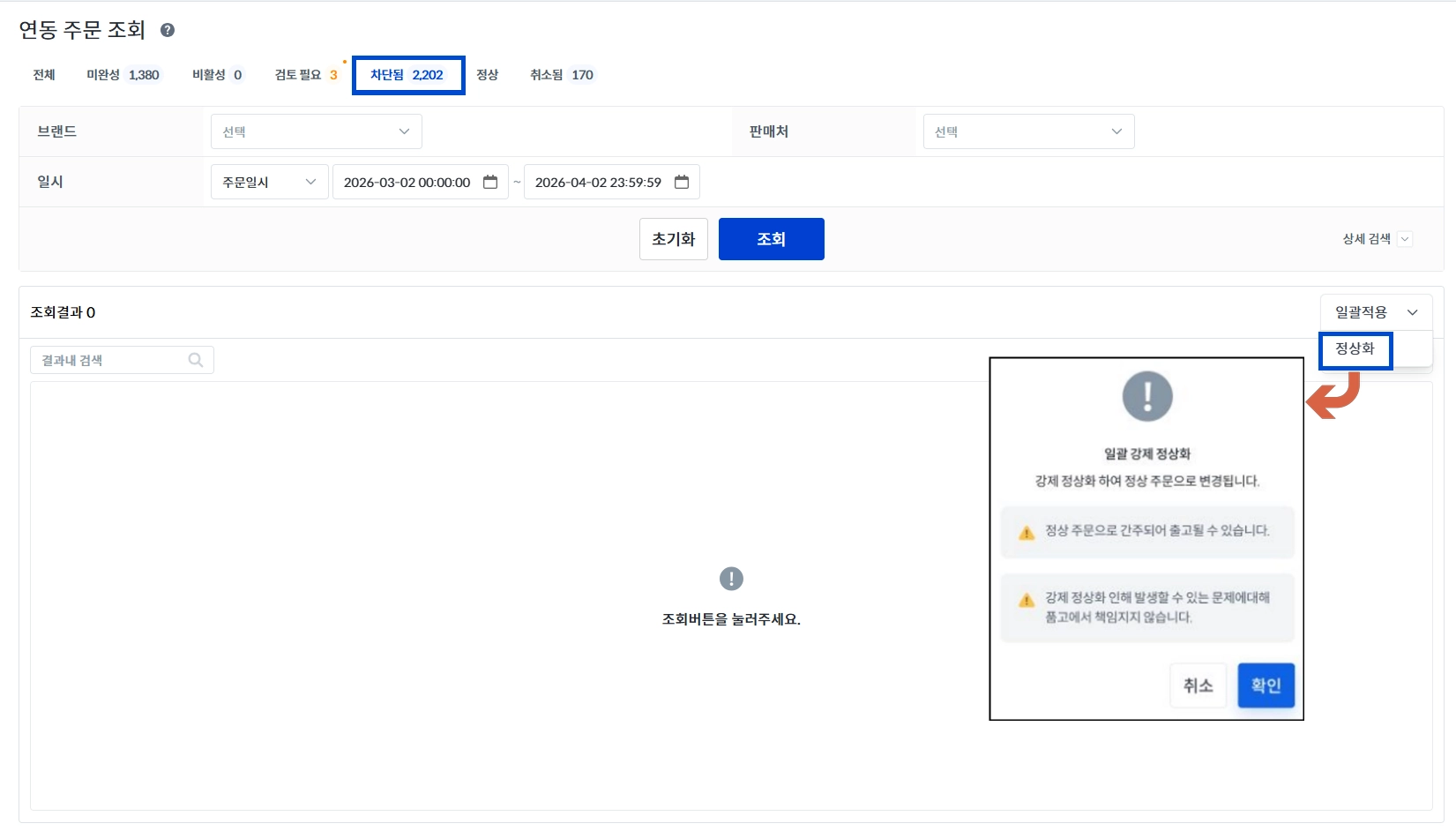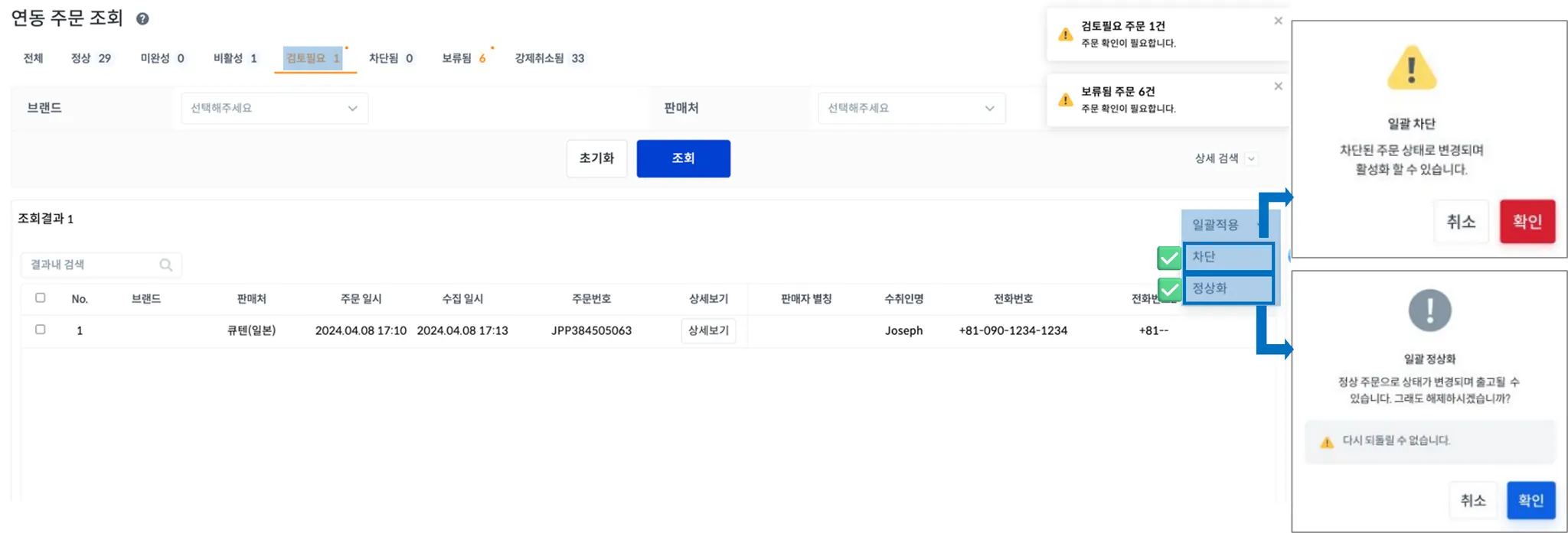 정상화 : 차단 주문을 정상 주문 상태로 변경 가능 / 정상 탭에서 확인 가능