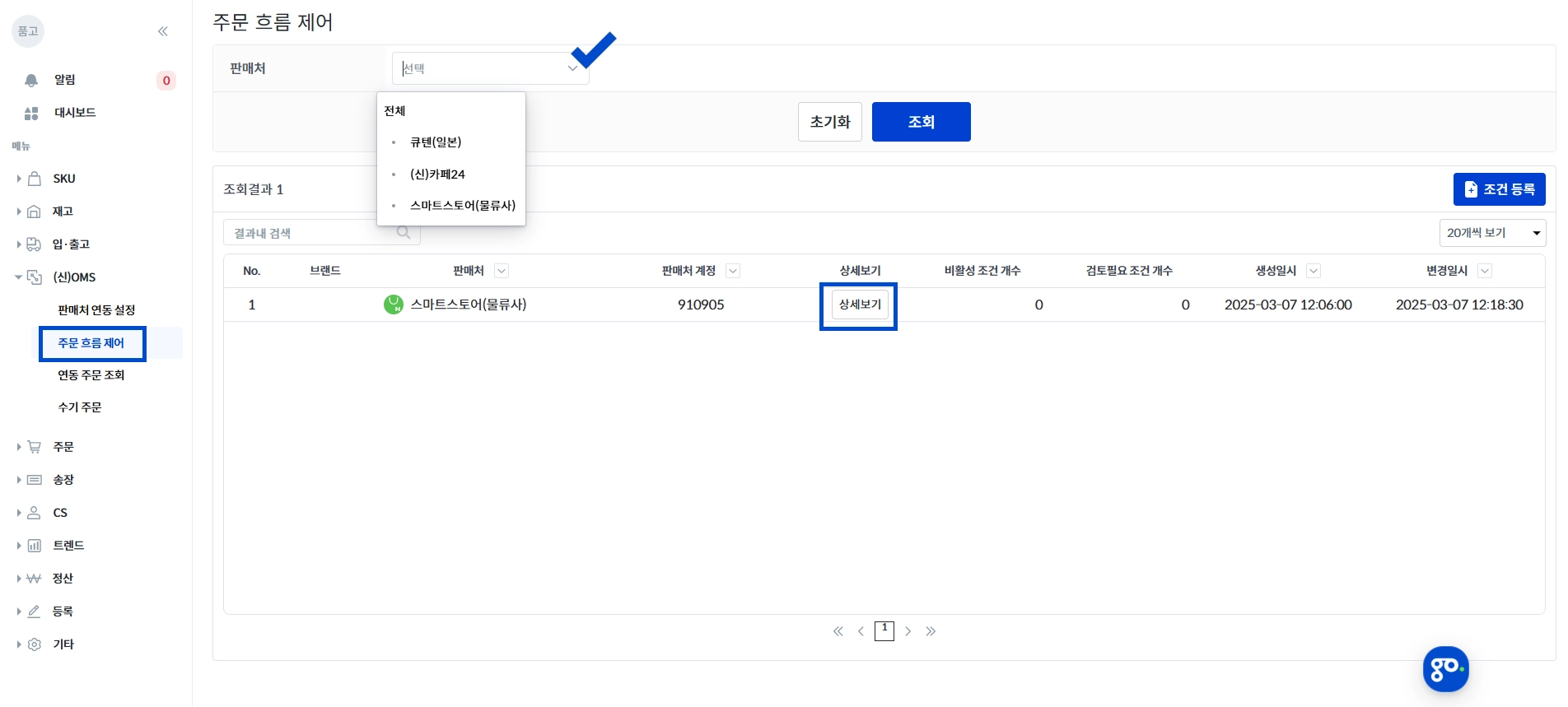 상세보기 : 판매처별 주문 흐름 제어 조건값 확인
