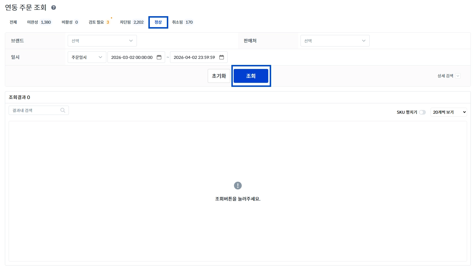 정상 : 연동된 주문 중 정상 처리된 주문 확인