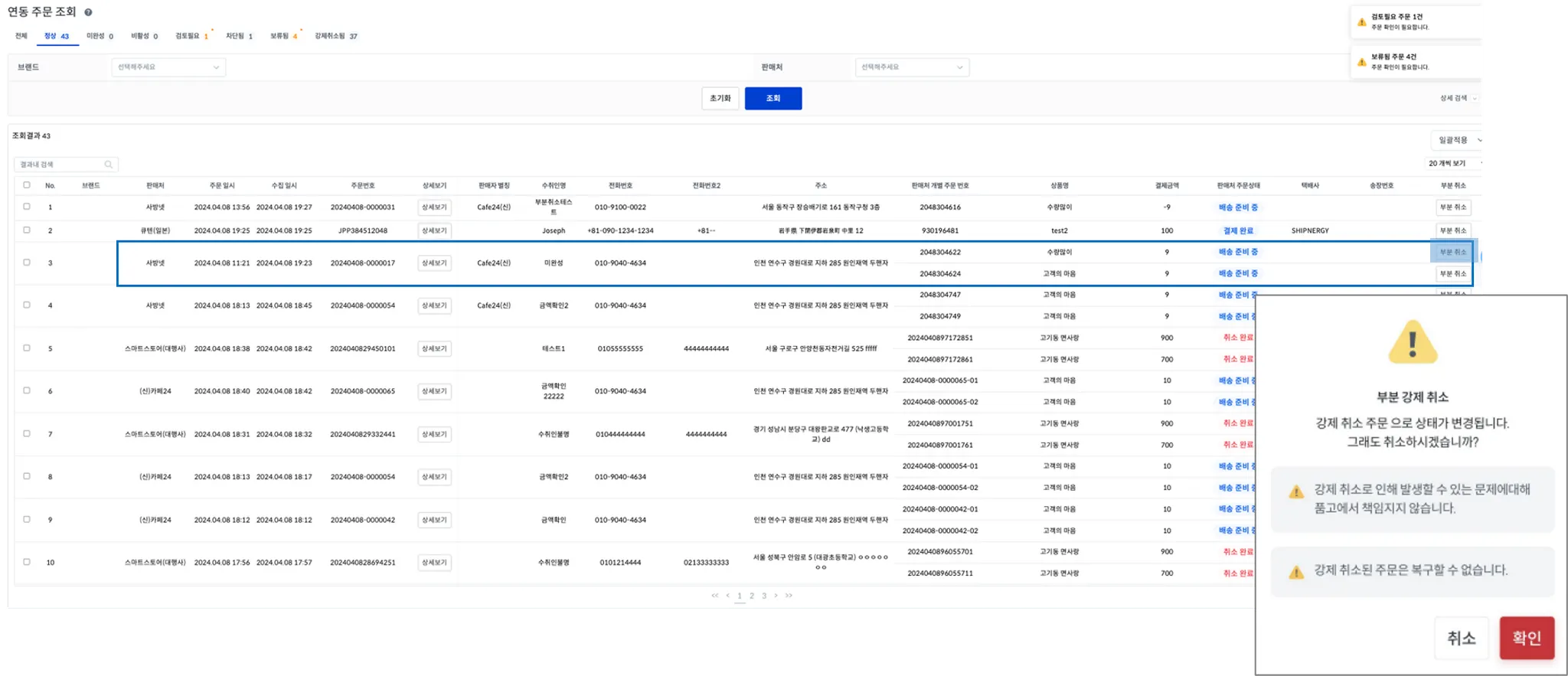 강제취소 : 연동된 주문 중 강제취소된 주문 확인