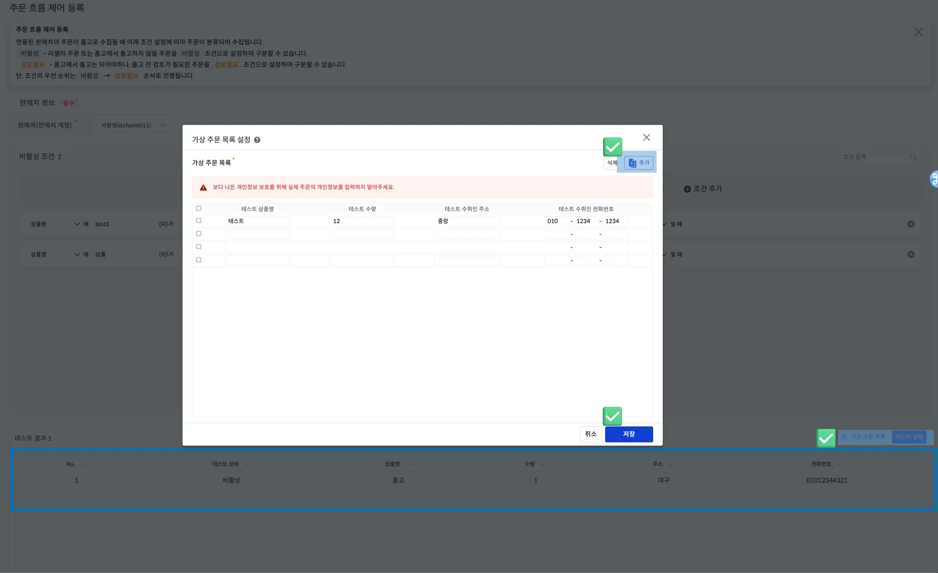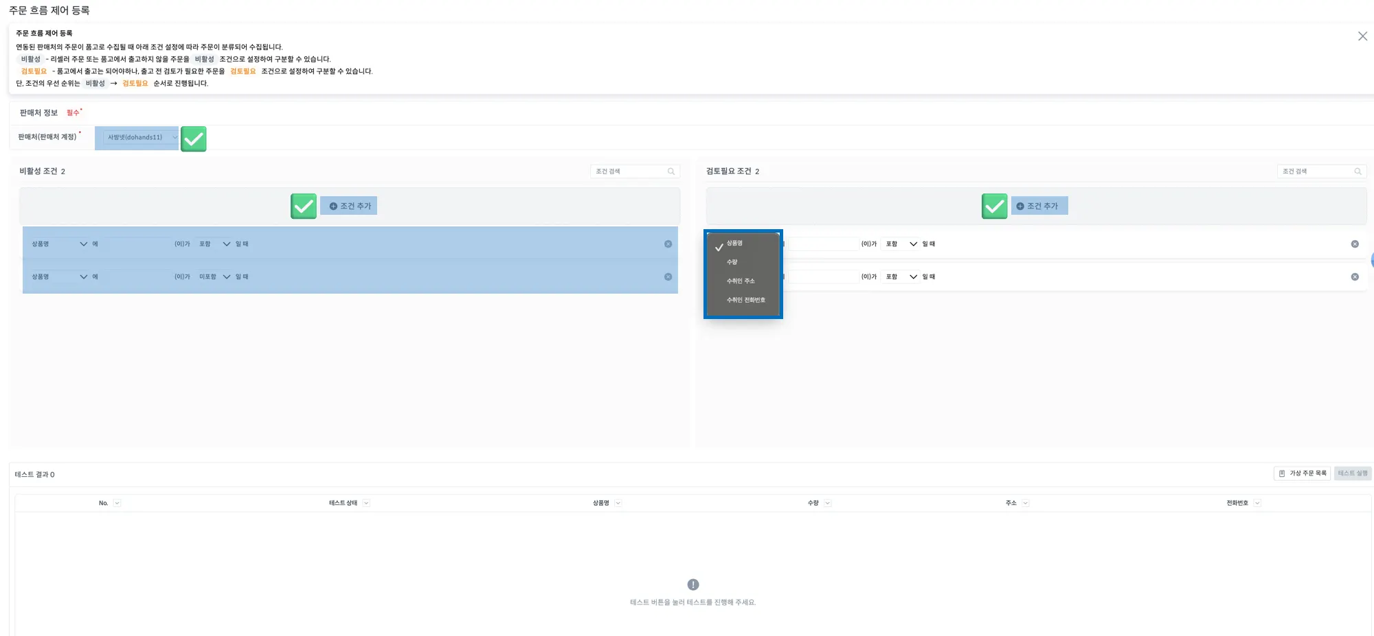 비활성, 검토필요 조건값을 가상의 주문으로 테스트 할 수 있는 기능