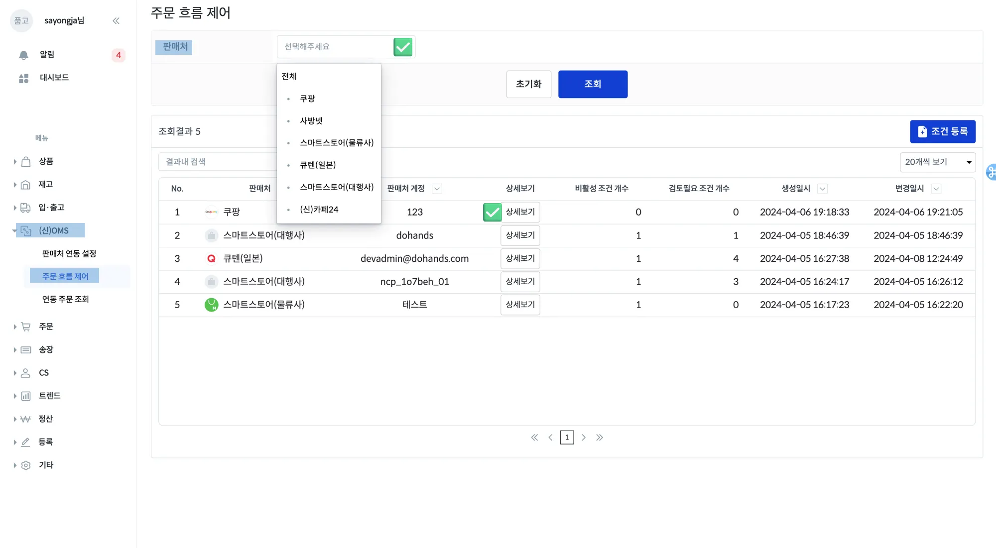 연동 된 판매처의 주문 흐름 제어 설정 확인이 가능한 기능