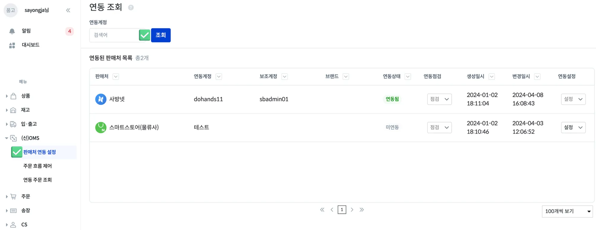 [1] 품고 나우 > (신)OMS > 판매처 연동 설정