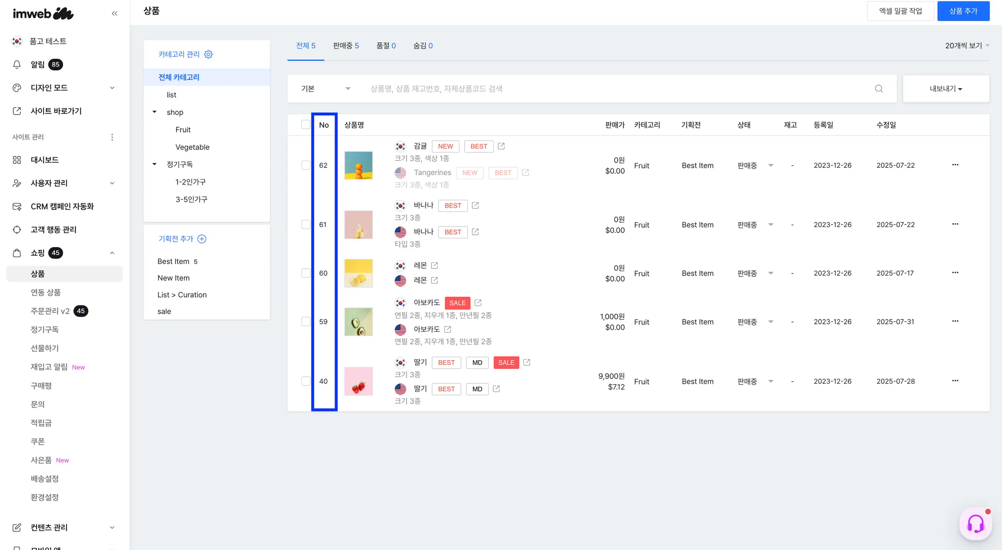 아임웹 관리 페이지 ‘쇼핑’ → ‘상품’ 메뉴 클릭해 주세요.