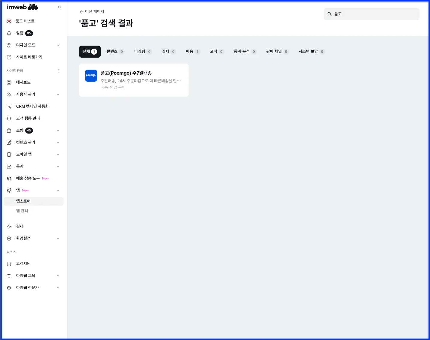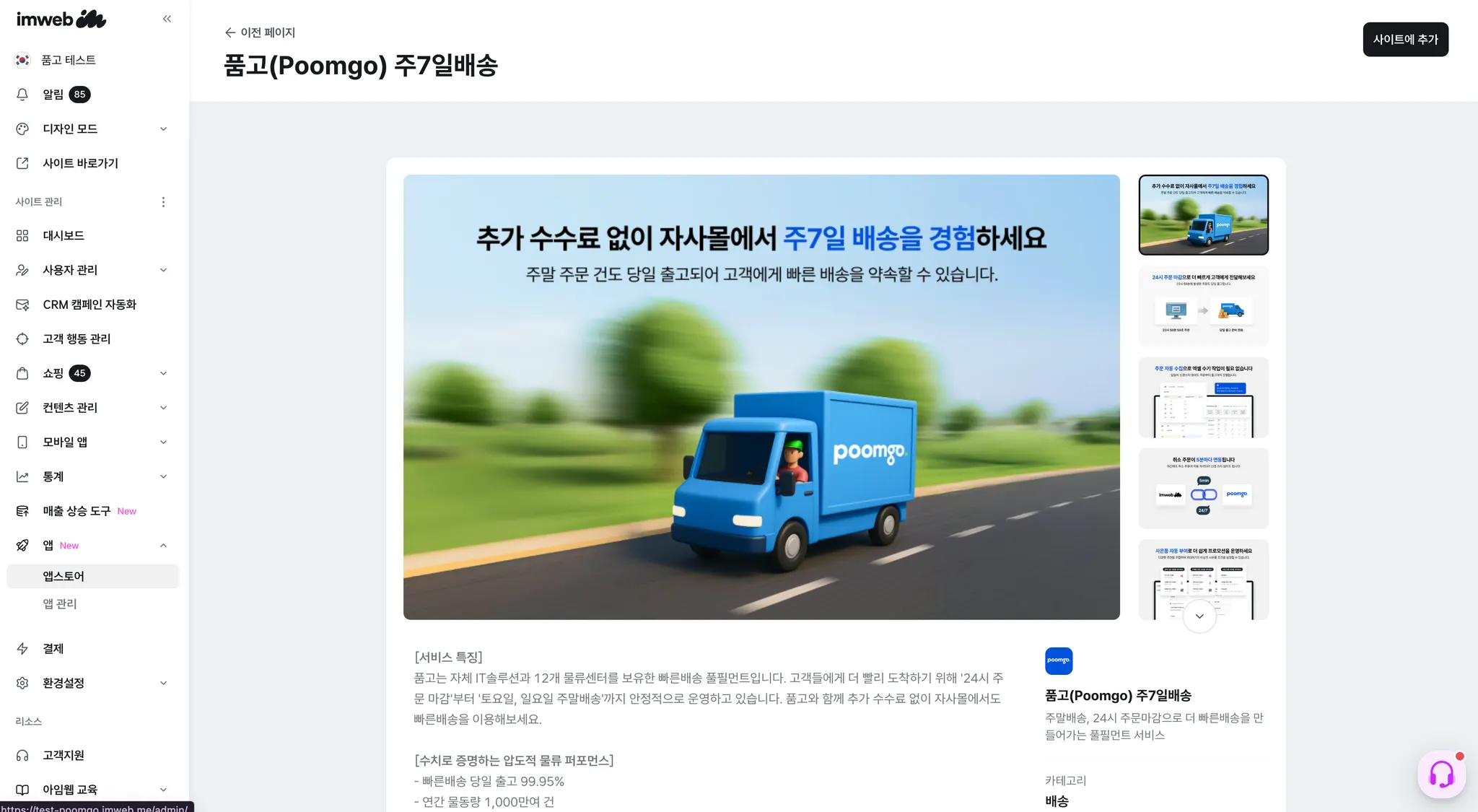 아임웹 관리 페이지에서 ‘앱’ → ‘앱 관리’ 메뉴에서 품고(Poomgo) 주7일배송 연동 완료를 확인해 주세요.