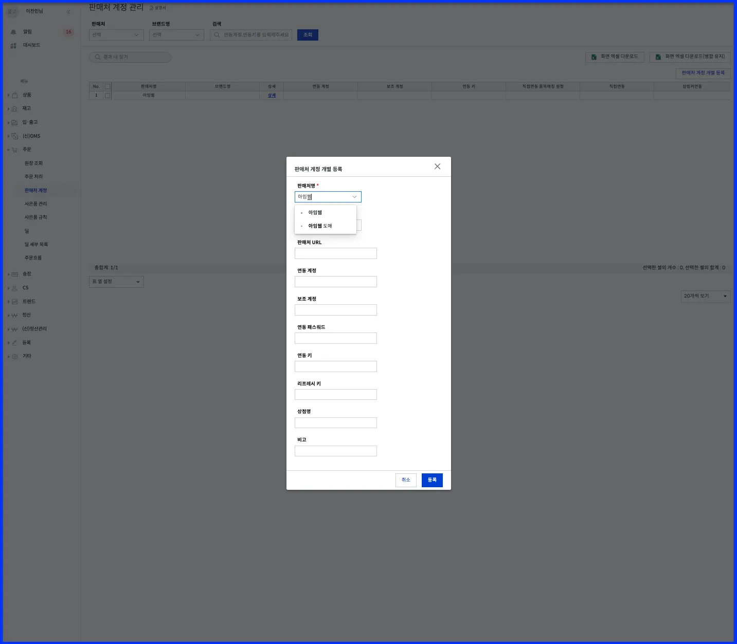좌측 메뉴 중 ‘주문’ → ‘판매처 계정’을 클릭해 주세요.
