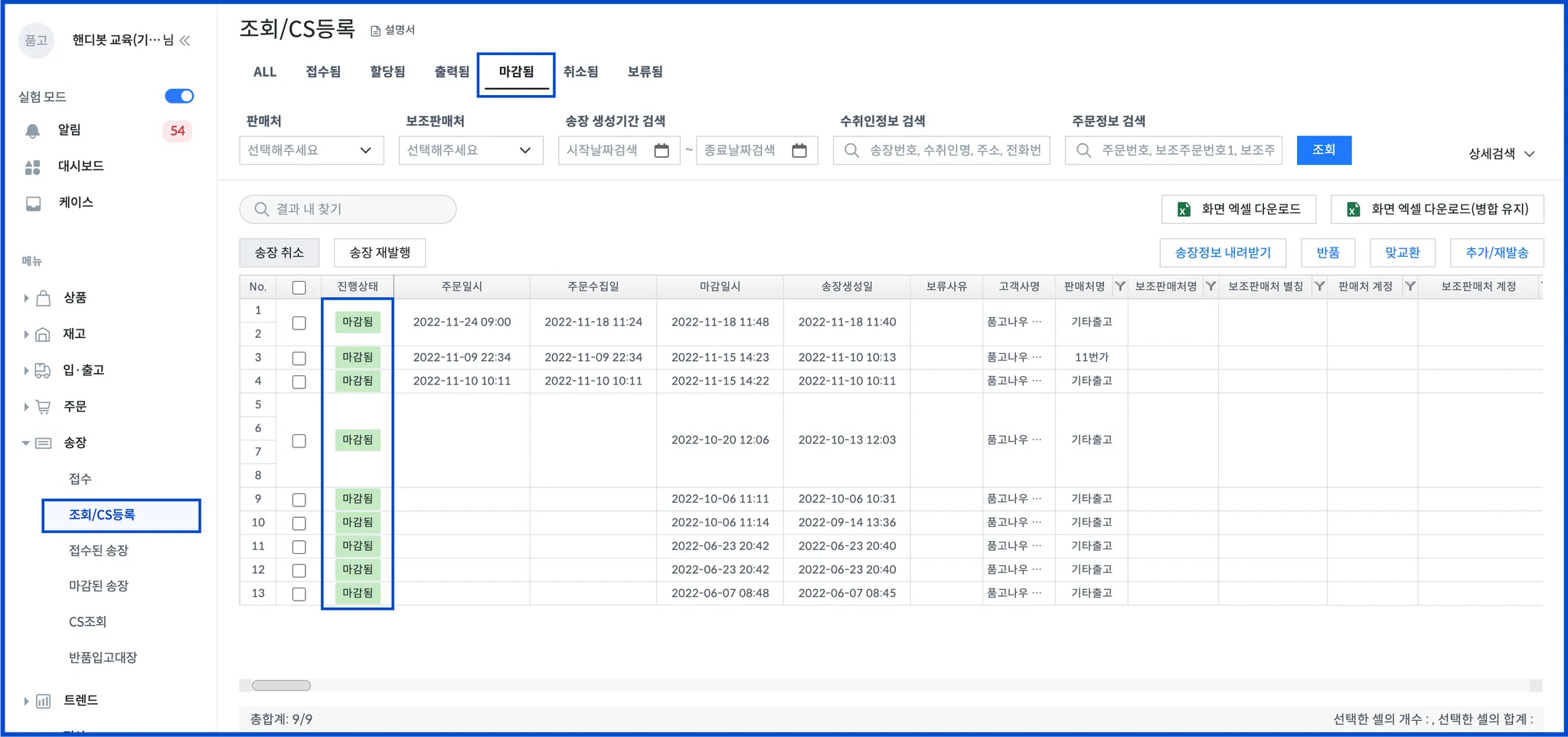 마감됨 상태에서 운송장 번호를 송신합니다.