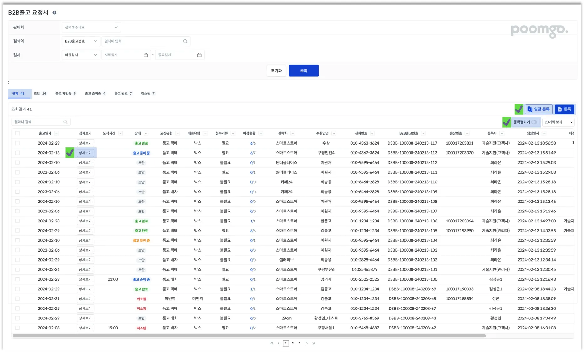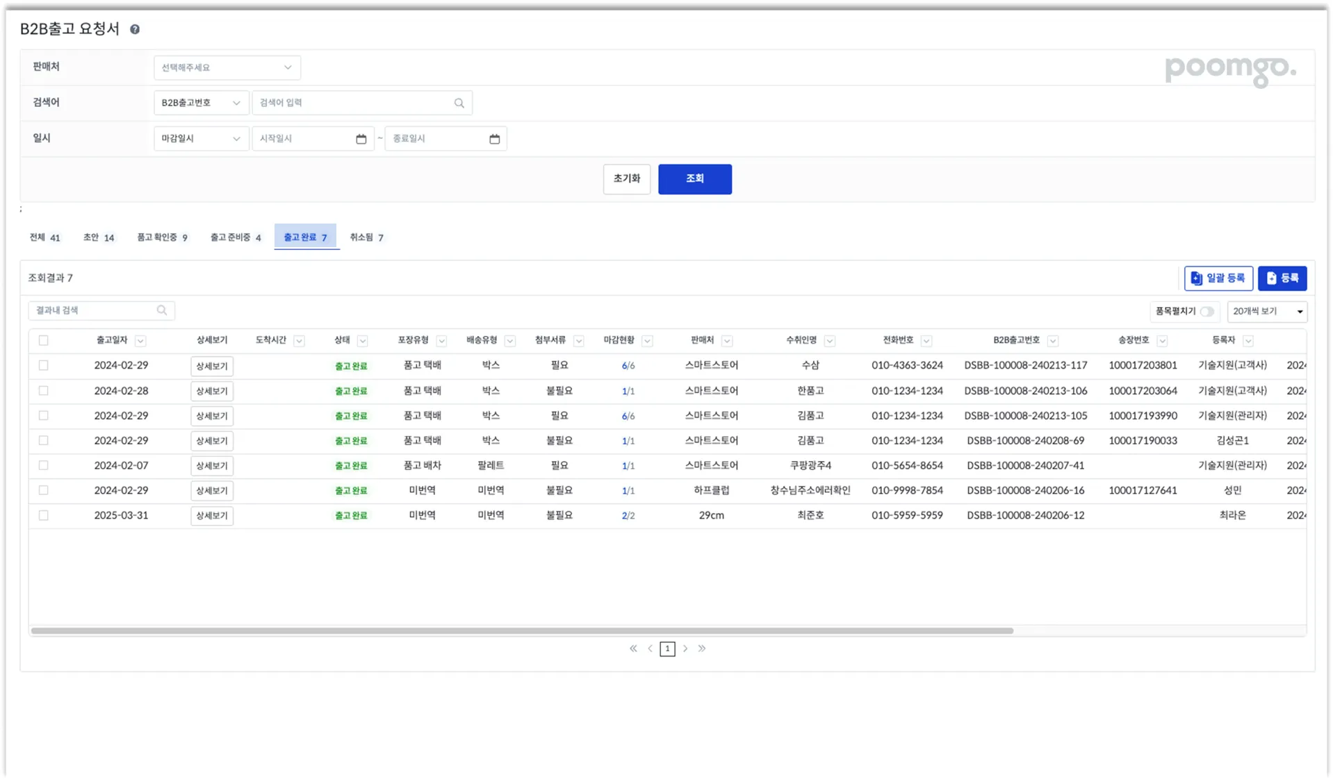 전체 : B2B 출고요청서(신)으로 생성한 모든 출고 건 확인