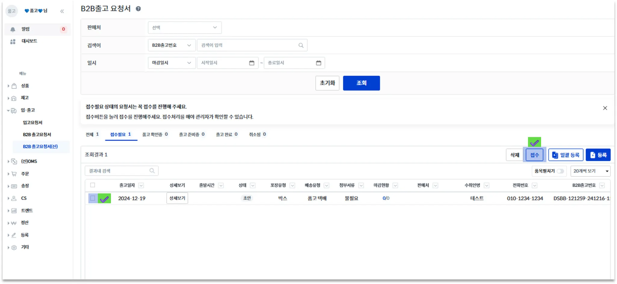 접수 : 등록한 B2B 출고 내용을 접수 처리 시 사용