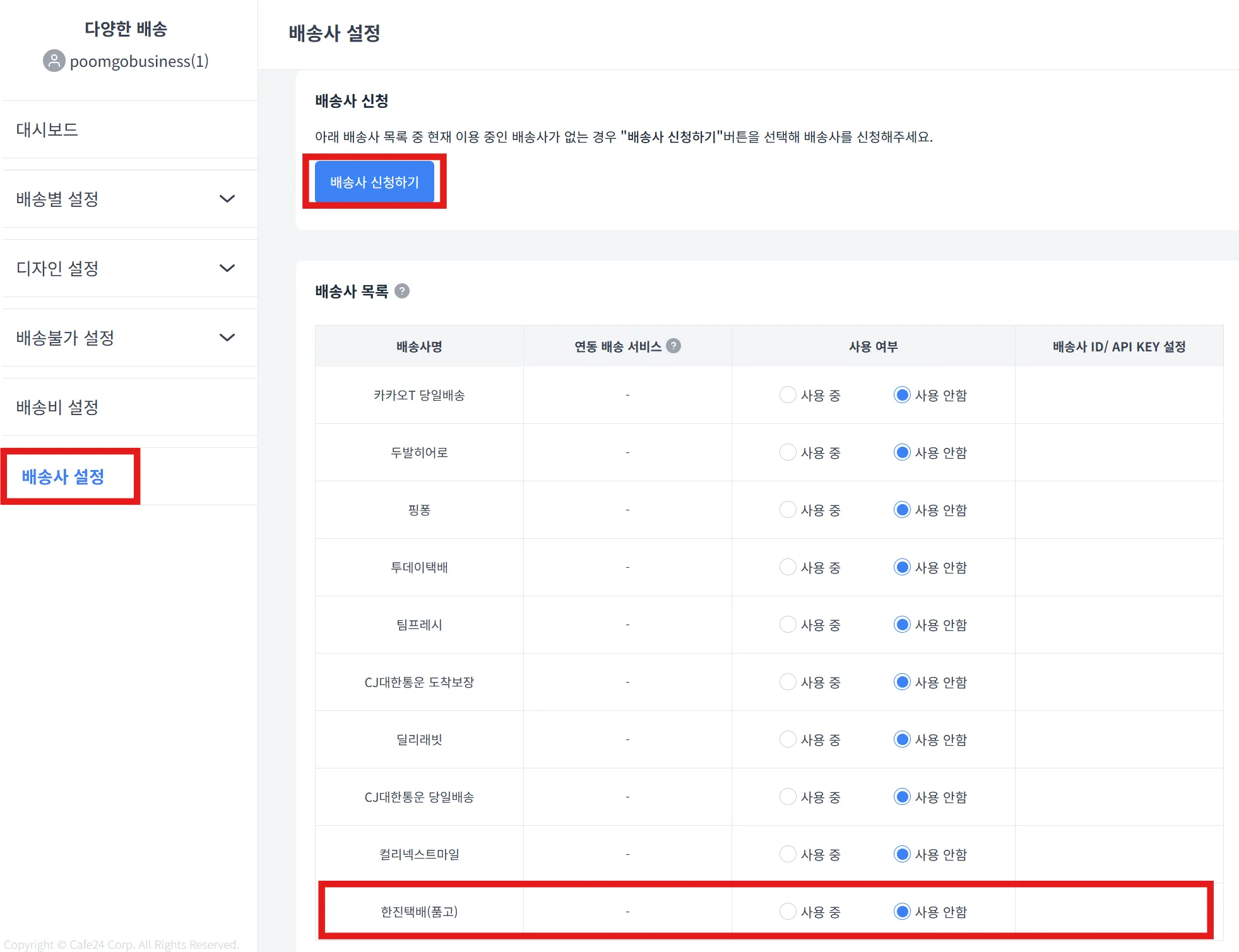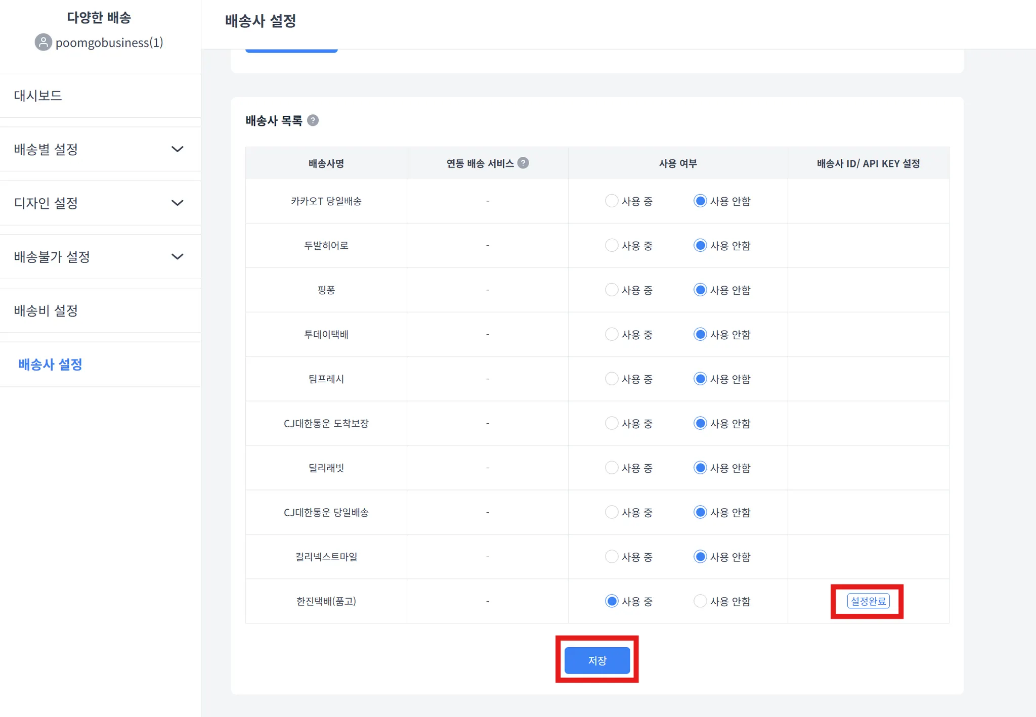 다양한 배송앱의 배송사 설정 메뉴에서 배송사 목록 하단에 있는 ‘한진택배(품고)’를 ‘사용 중’으로 설정해 주세요.