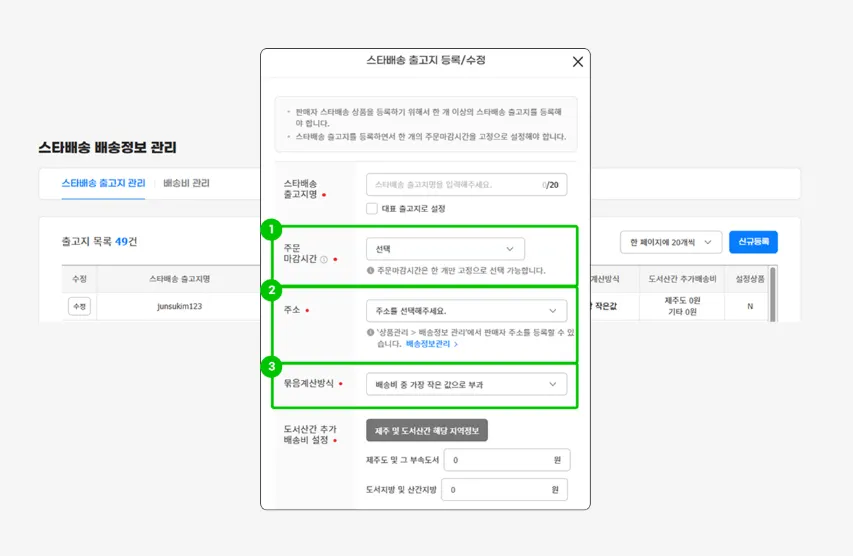 이용중인 품고 물류센터 정보 입력하여 스타배송 출고지 등록 (주문마감시간, 주소, 묶음계산방식 등)