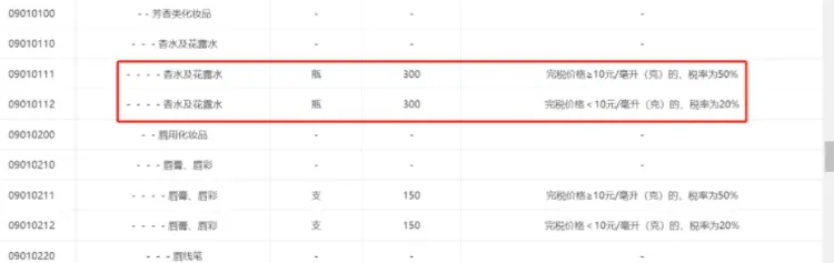 향수 및 플로럴워터 (병) 300 완세가격 ≥ 10CNY/ml(g), 세율50%