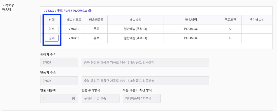 상품별 [수정] → [배송정보 - 도착보장 배송비]