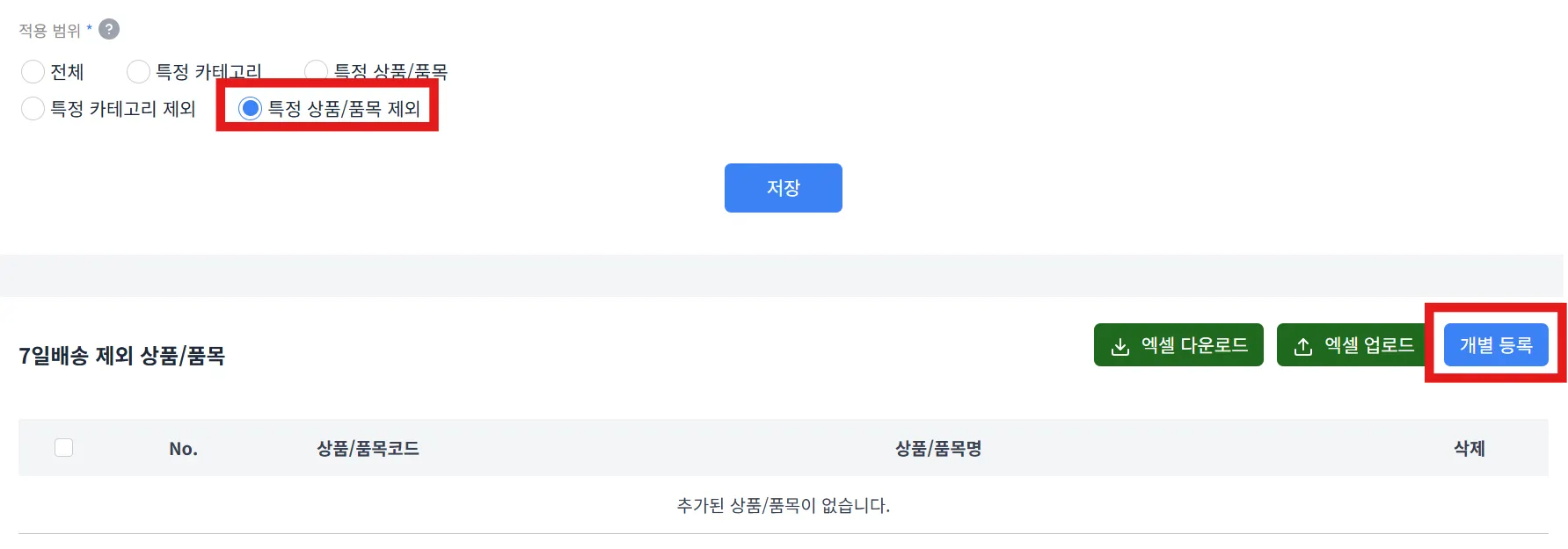 특정 상품/품목 제외를 선택한 후 ‘