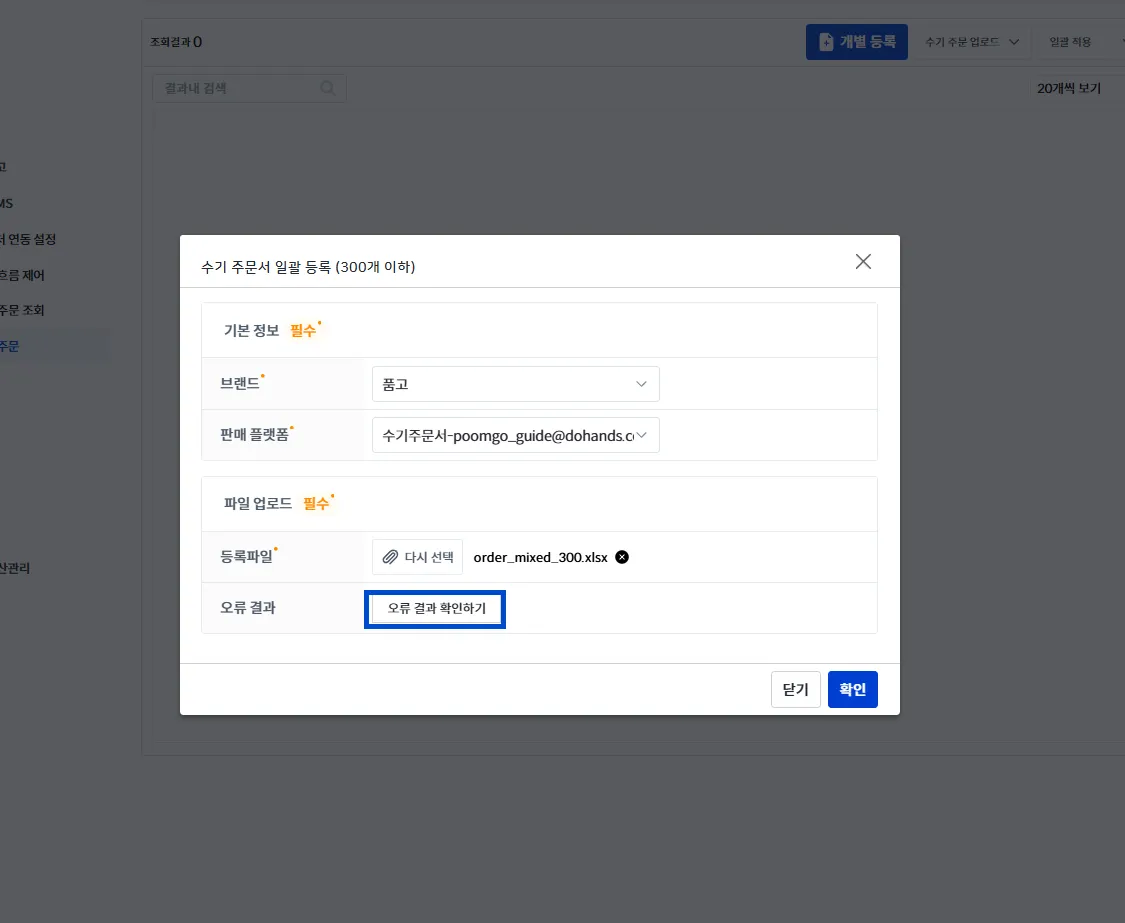 주문 업로드가 실패했을 때 [오류 결과 확인하기]라는 버튼이 뜨게 됩니다.
