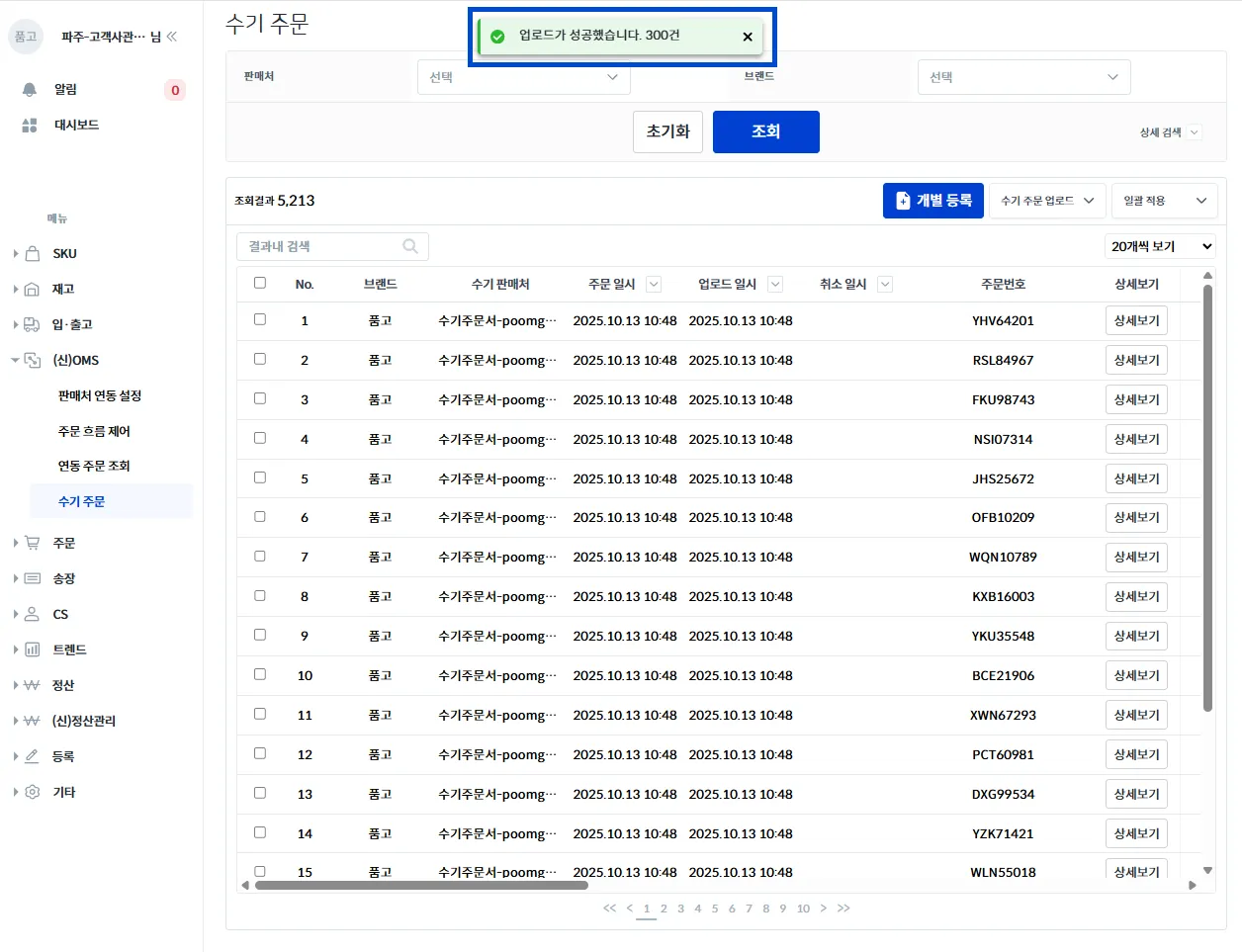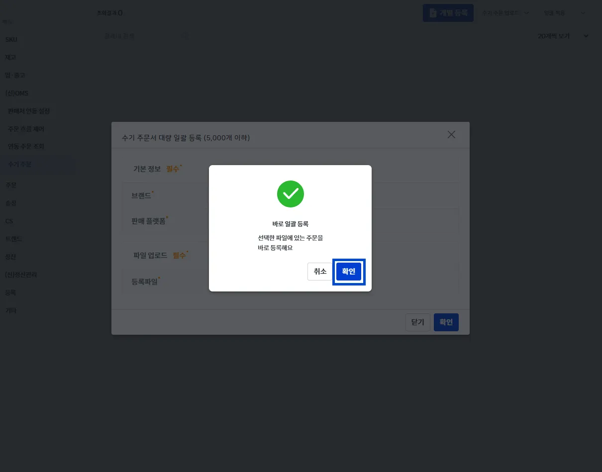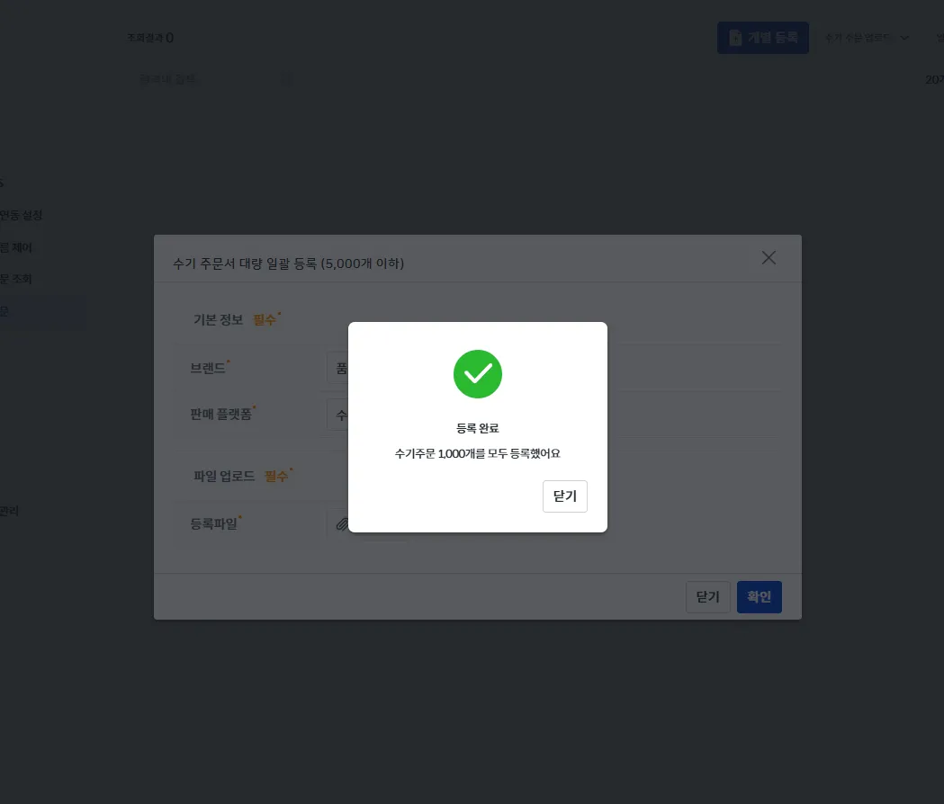 업로드가 모두 성공했다면, [수기 주문] 화면에서 바로 노출되며 약 5~10분 뒤 [주문 처리]에서 확인이 가능합니다.