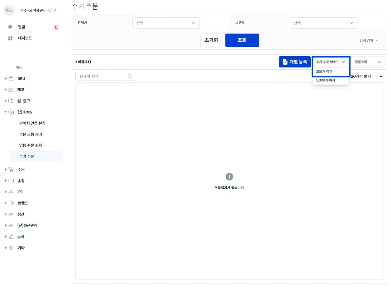 품고나우 좌측의 [(신)OMS → 수기 주문]으로 이동해 주세요.