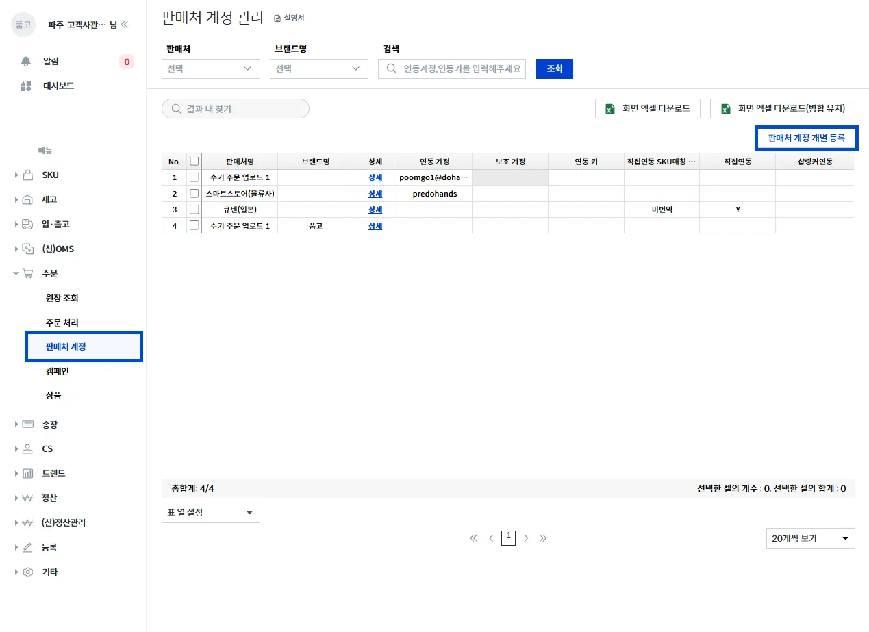 상단 메뉴에서 [주문 → 판매처 계정 → 판매처 계정 개별 등록] 을 클릭하세요.