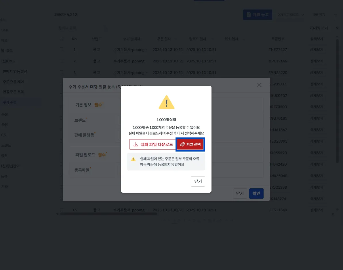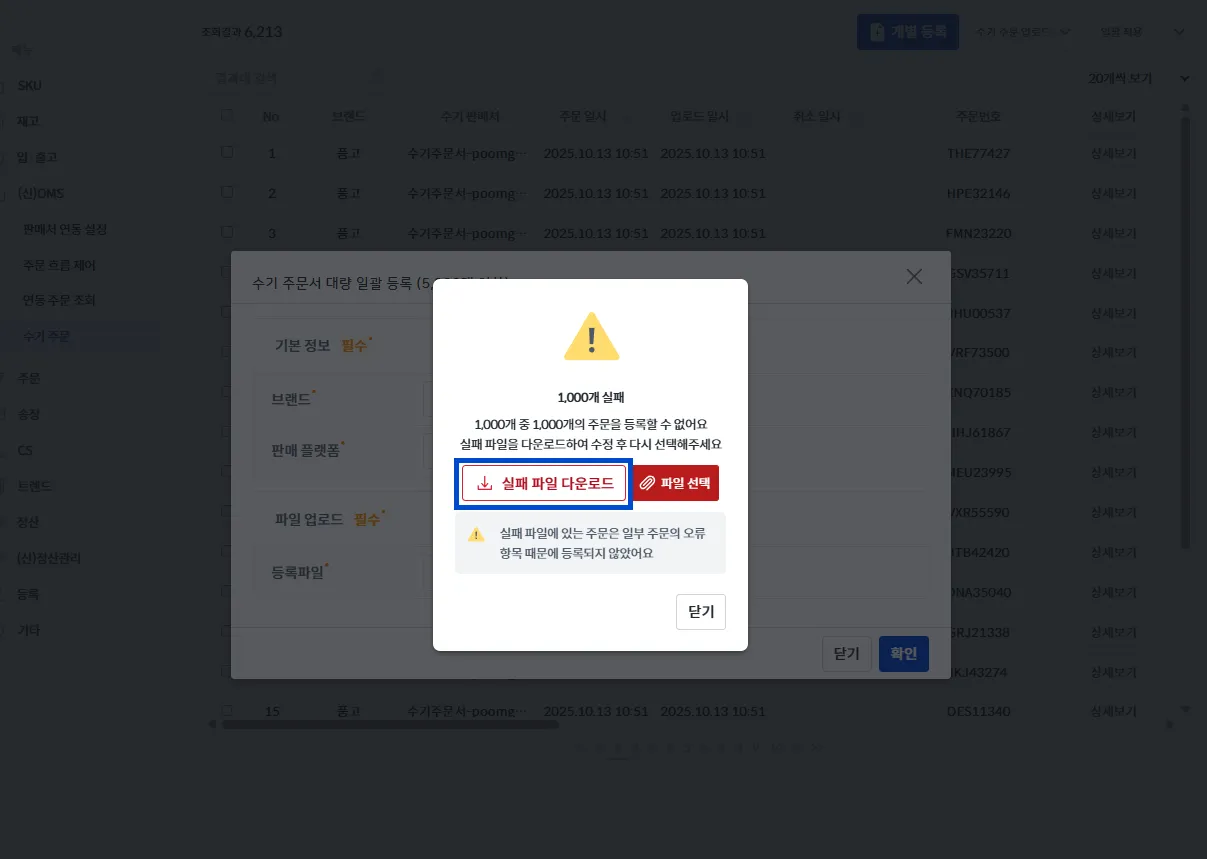 실패한 주문을 제외한 나머지 주문은 정상적으로 업로드되었기에, [실패 파일 다운로드] 버튼을 눌러 오류 주문을 수정한 뒤 다시 업로드해 주세요.